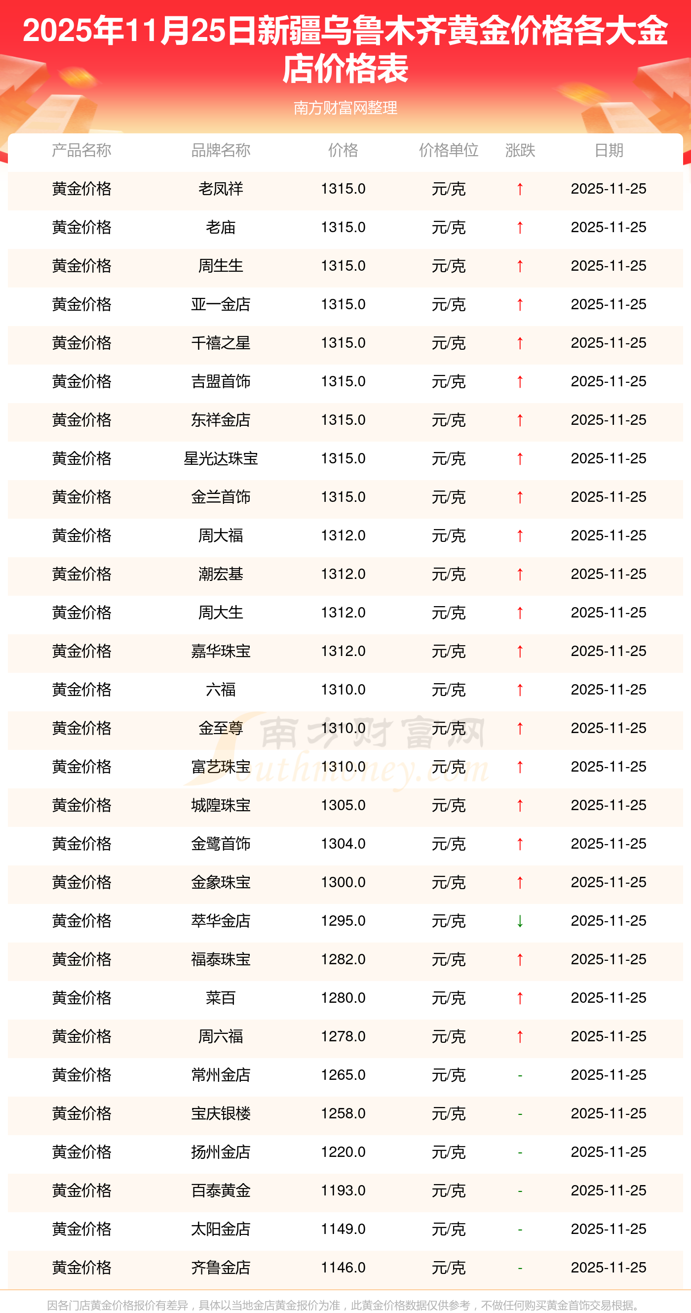 今日新疆烏魯木齊黃金價格最高的金店是老鳳祥,報價1315.0元/克,黃金價格最低的金店是齊魯金店,報價1146.0元/克。今日黃金價格高低差為169元/克。