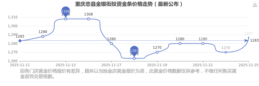 今日(2025年11月25日)重慶忠縣金銀街投資金條最新價格為1287.0元/克。