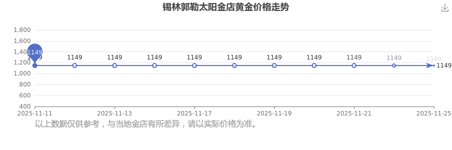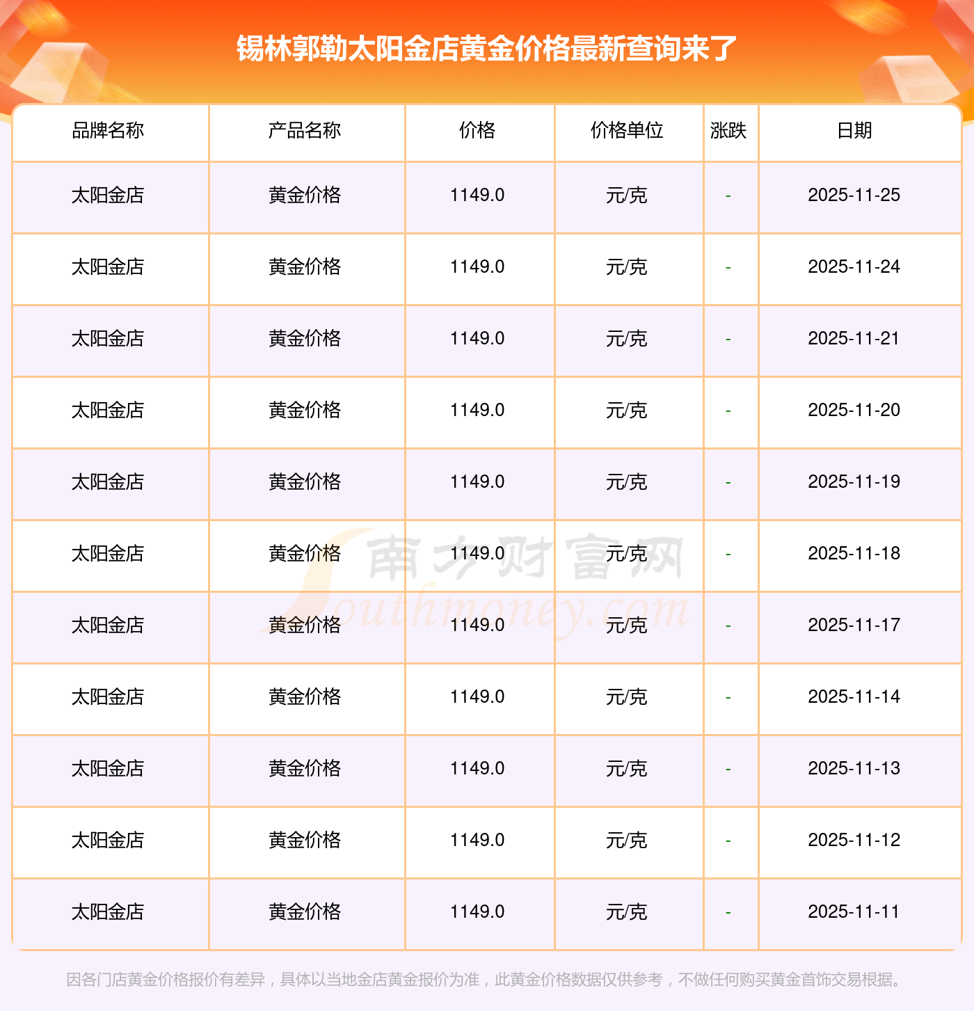 2025年11月25日當(dāng)天,錫林郭勒太陽金店黃金價(jià)格的單價(jià)是 1149.0元/克。