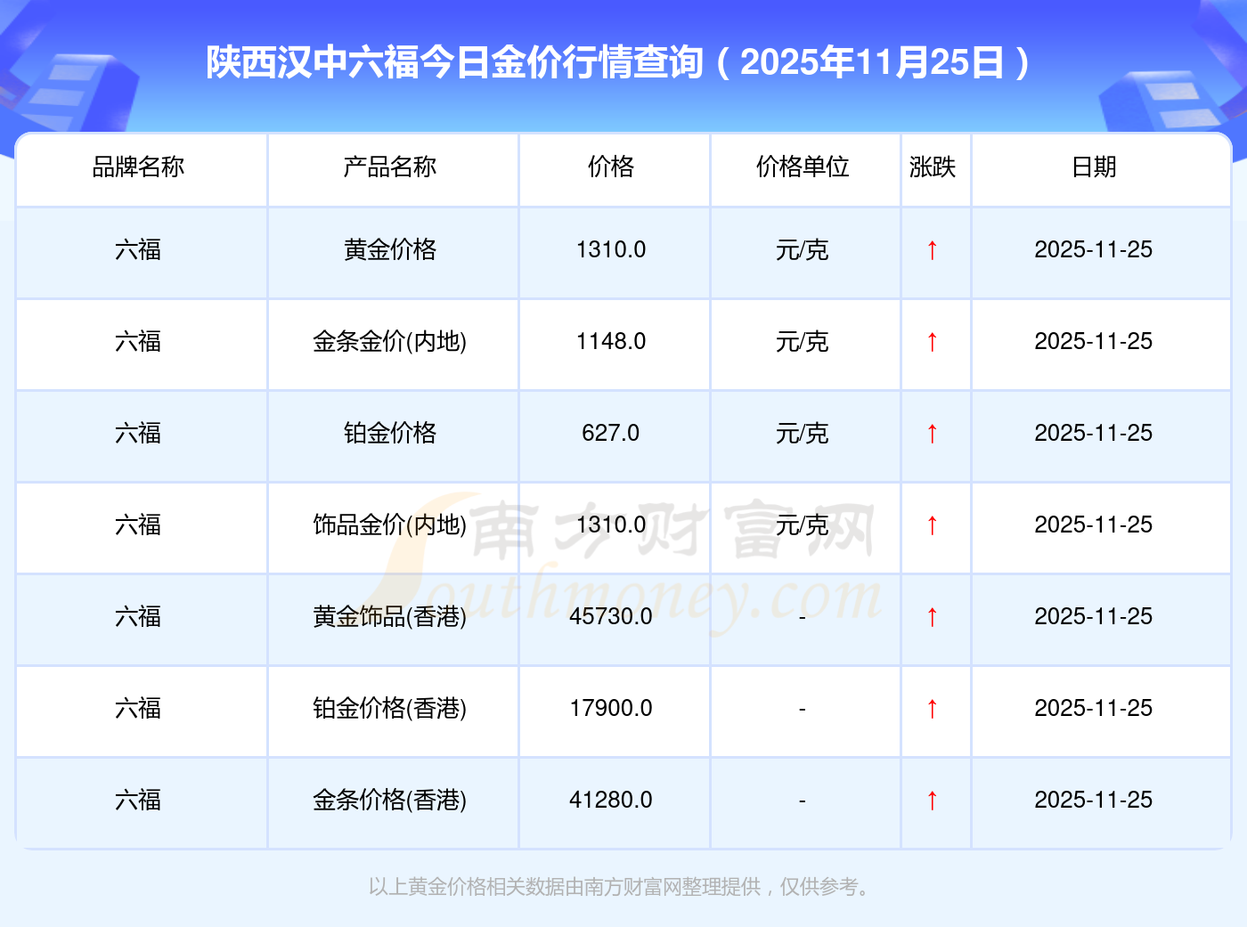 2025年11月25日陜西漢中六福黃金一克的市場行情價是多少?黃金價格1312.0元/克,鉑金價格627.0元/克,飾品金價(內(nèi)地)1312.0元/克,黃金飾品(香港)45780.0,鉑金價格(香港)17900.0,金條價格(香港)41290.0,金條金價(內(nèi)地)1148.0元/克,黃金價格1315.0元/克,鉑金價格600.0元/克,足金價格1315.0元/克,黃金價格1278.0元/克。