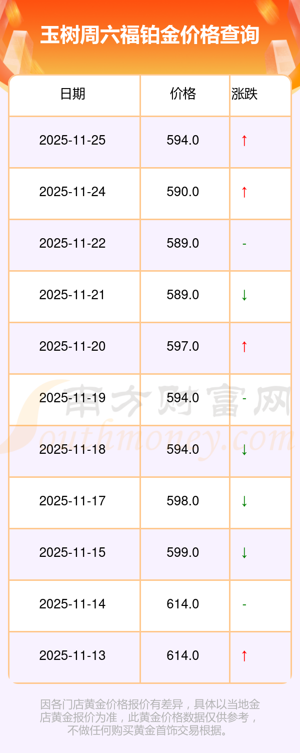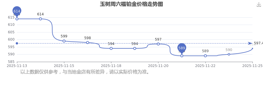 2025年11月25日玉樹周六福鉑金價格為594.0元/克。