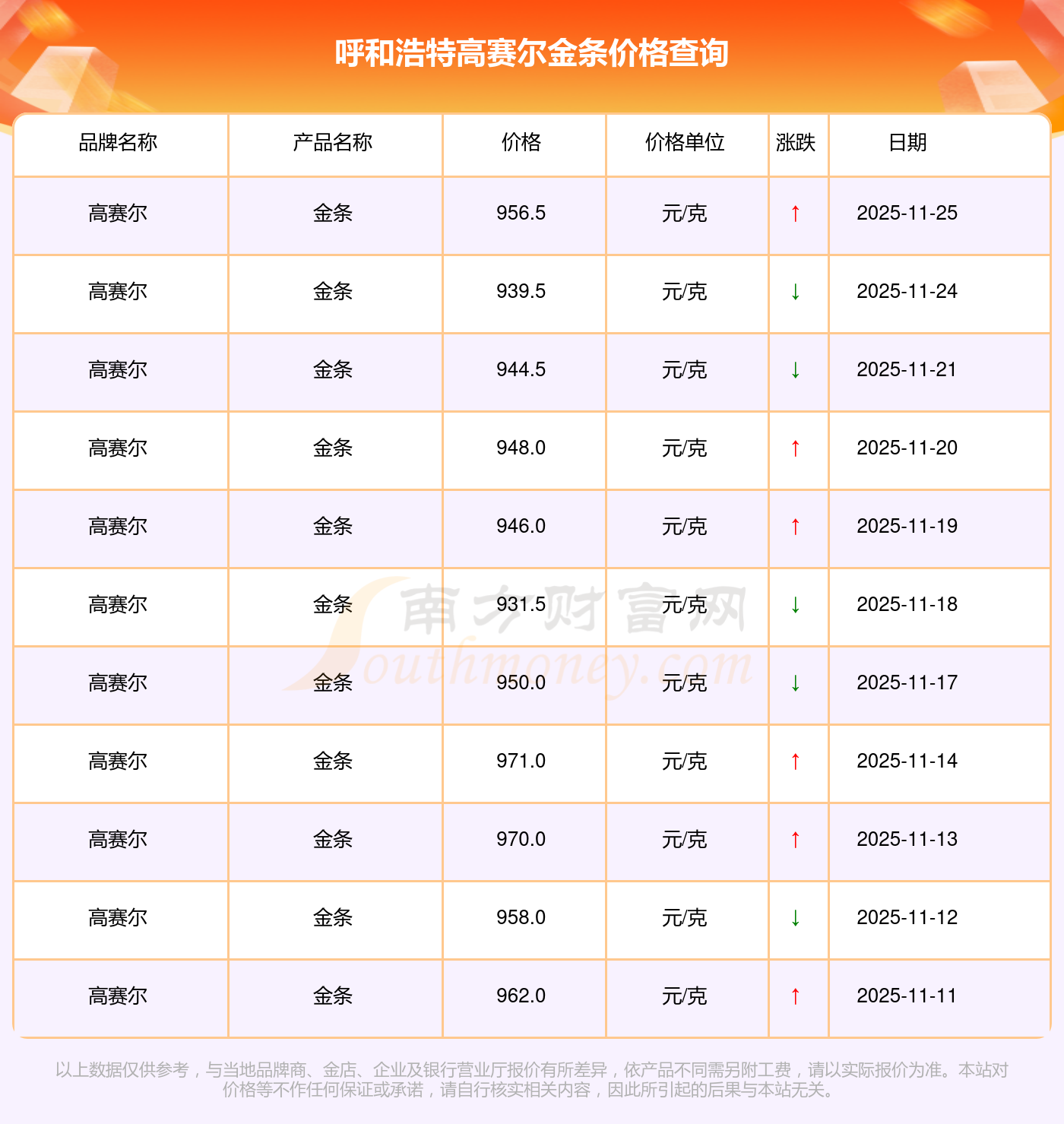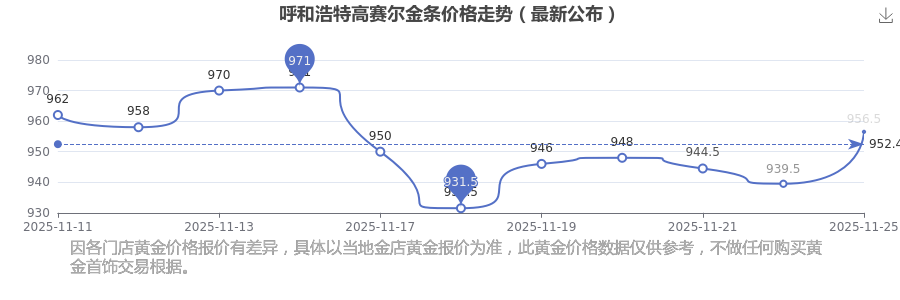 今日(2025年11月25日)呼和浩特高賽爾金條價格:956.5元/克。