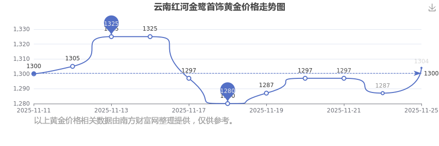 今日(2025年11月25日),云南紅河金鷺首飾黃金價格的定價為 1304.0元/克。