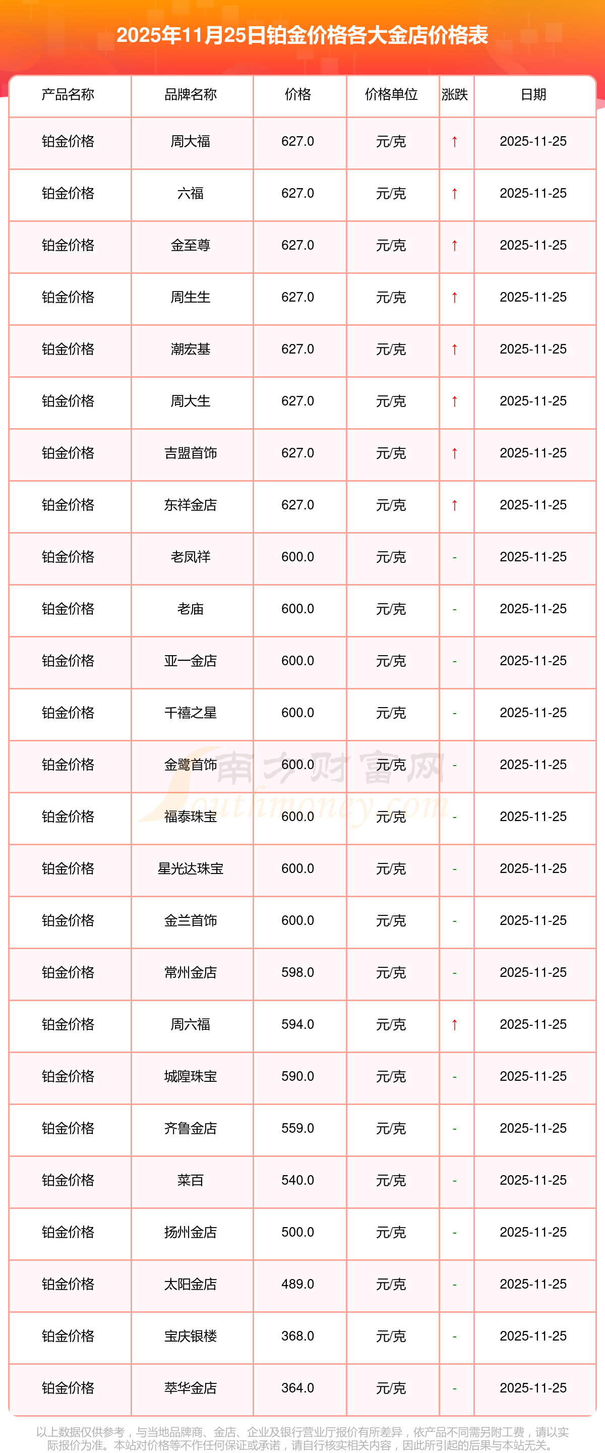 2025年11月25日各大金店鉑金價格最新價格:周大福1312.0元/克,周大福627.0元/克,周大福1312.0元/克,周大福45780.0,周大福17900.0,周大福41290.0,周大福1148.0元/克,老鳳祥1315.0元/克,老鳳祥600.0元/克,老鳳祥1315.0元/克,周六福1278.0元/克。