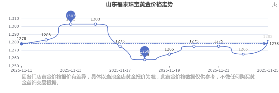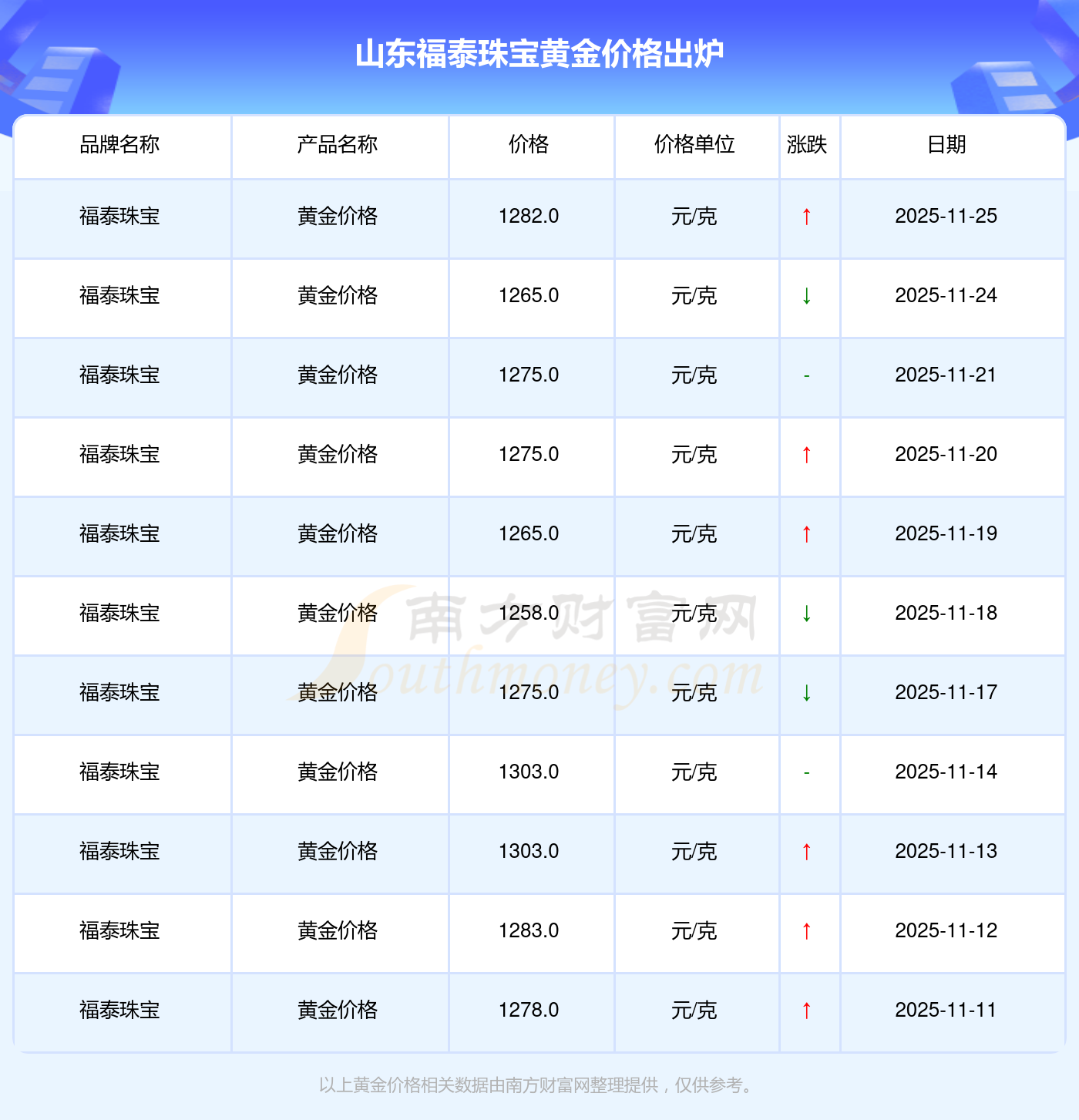 今日(2025年11月25日),山東福泰珠寶黃金價格的定價為 1282.0元/克。