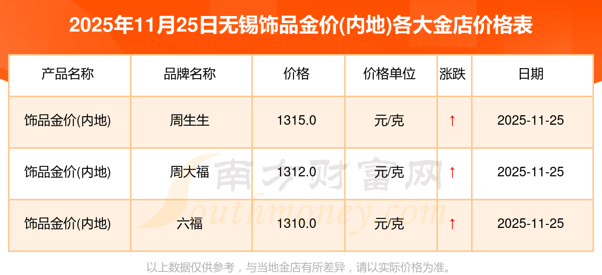 一、2025年11月25日無錫各大金店飾品金價(內(nèi)地)多少一克?無錫飾品金價(內(nèi)地)多少錢一克?