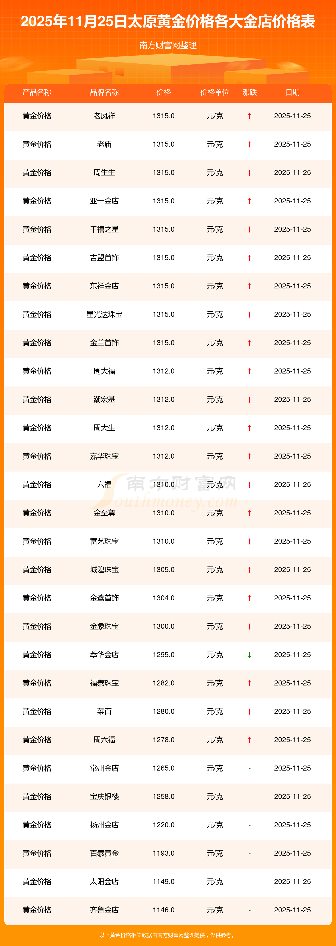2025年11月25日太原周大福、周大福、周大福、周大福、周大福、周大福、周大福、老鳳祥、老鳳祥、老鳳祥、周六福等各大金店品牌黃金價格最新價格行情來了,如下:周大福黃金價格1312.0元/克,周大福鉑金價格627.0元/克,周大福飾品金價(內(nèi)地)1312.0元/克,周大福黃金飾品(香港)45780.0,周大福鉑金價格(香港)17900.0,周大福金條價格(香港)41290.0,周大福金條金價(內(nèi)地)1148.0元/克,老鳳祥黃金價格1315.0元/克,老鳳祥鉑金價格600.0元/克,老鳳祥足金價格1315.0元/克,周六福黃金價格1278.0元/克。