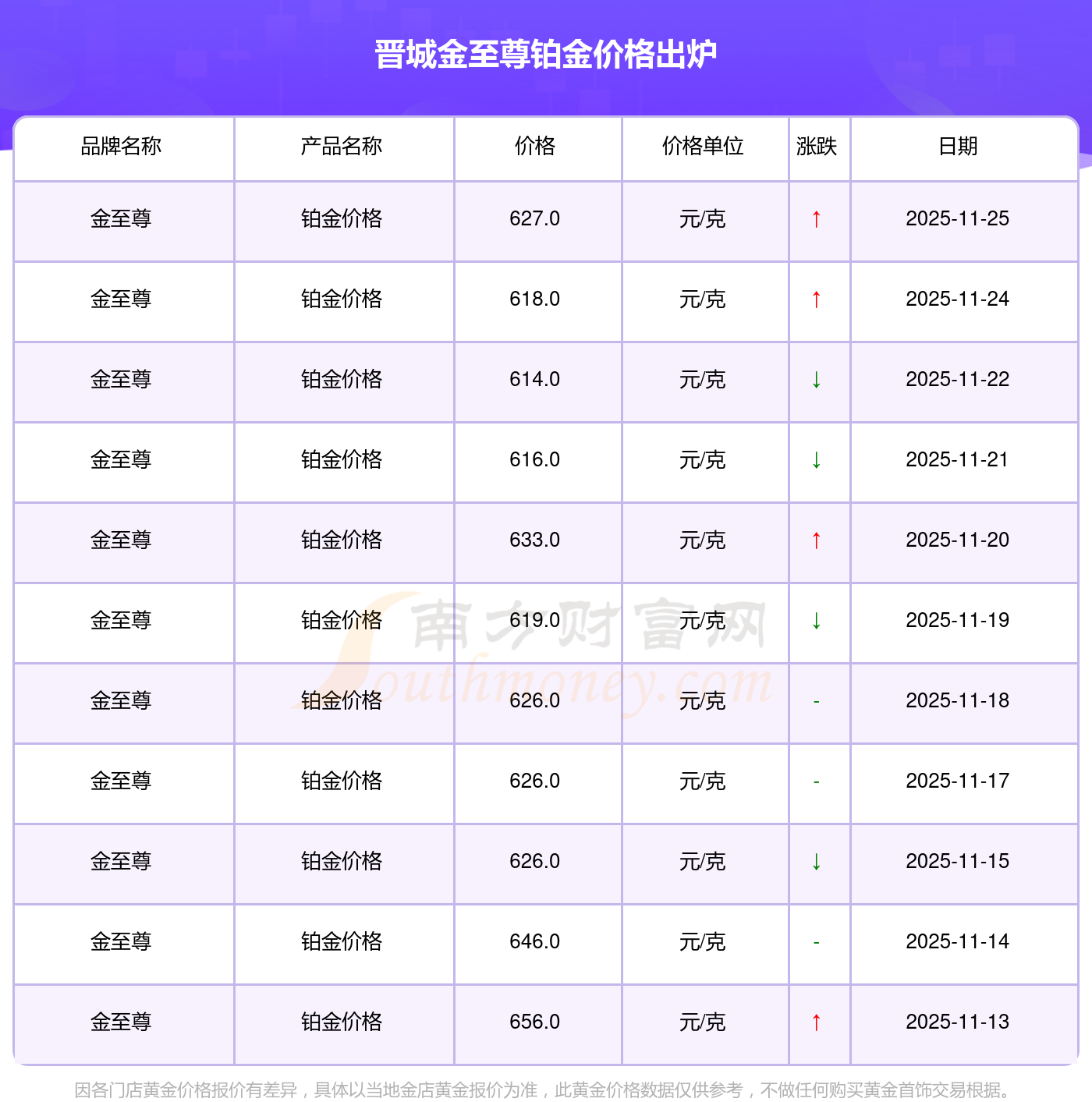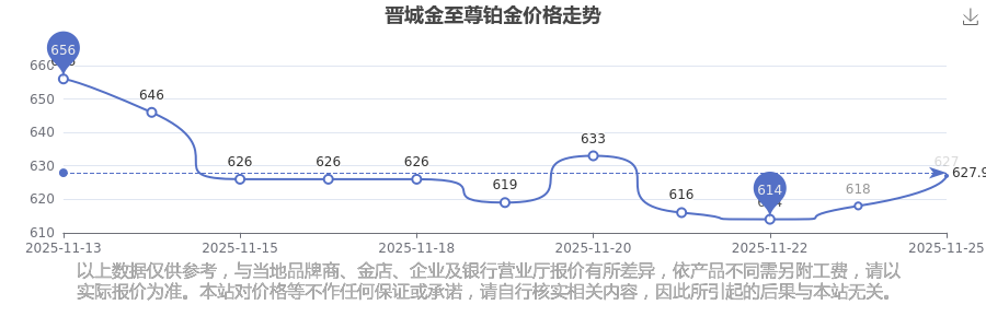 2025年11月25日,晉城金至尊鉑金價格每克的價值量定格在627.0元/克。