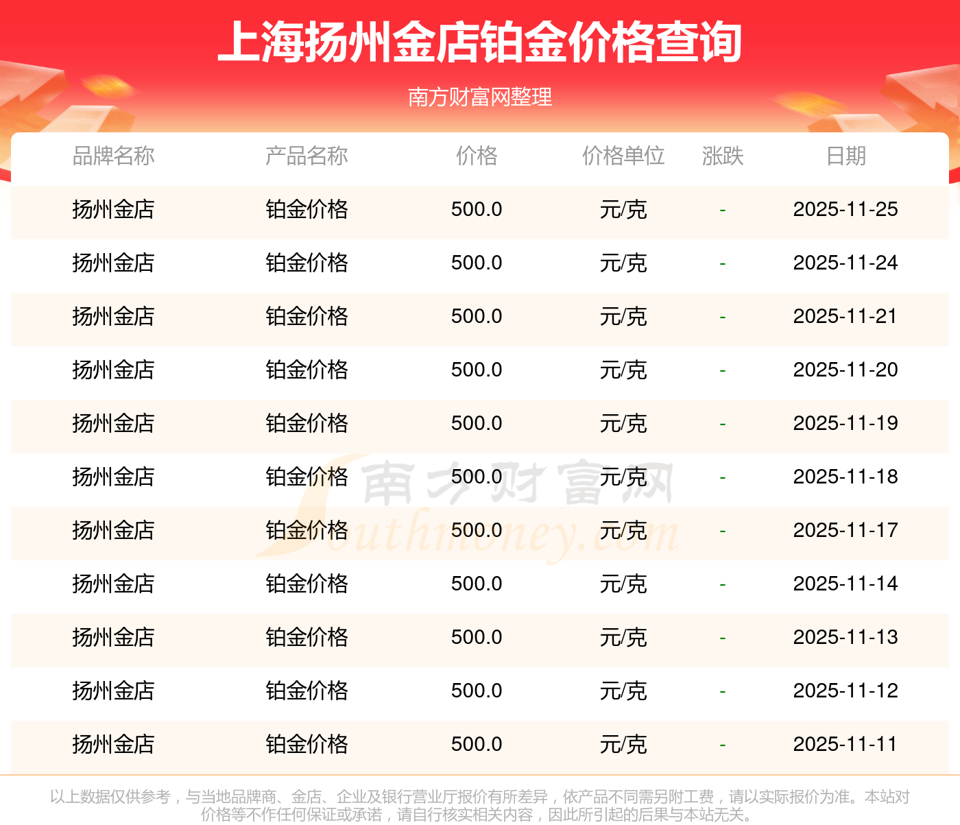 2025年11月25日上海揚(yáng)州金店鉑金價(jià)格為500.0元/克。