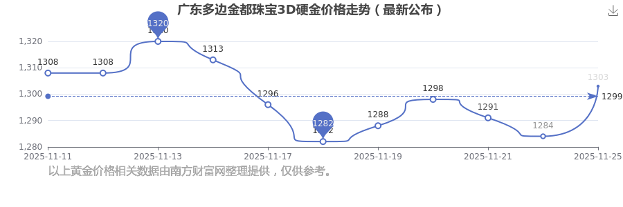 2025年11月25日當天,廣東多邊金都珠寶3D硬金的單價是 1303.0元/克。
