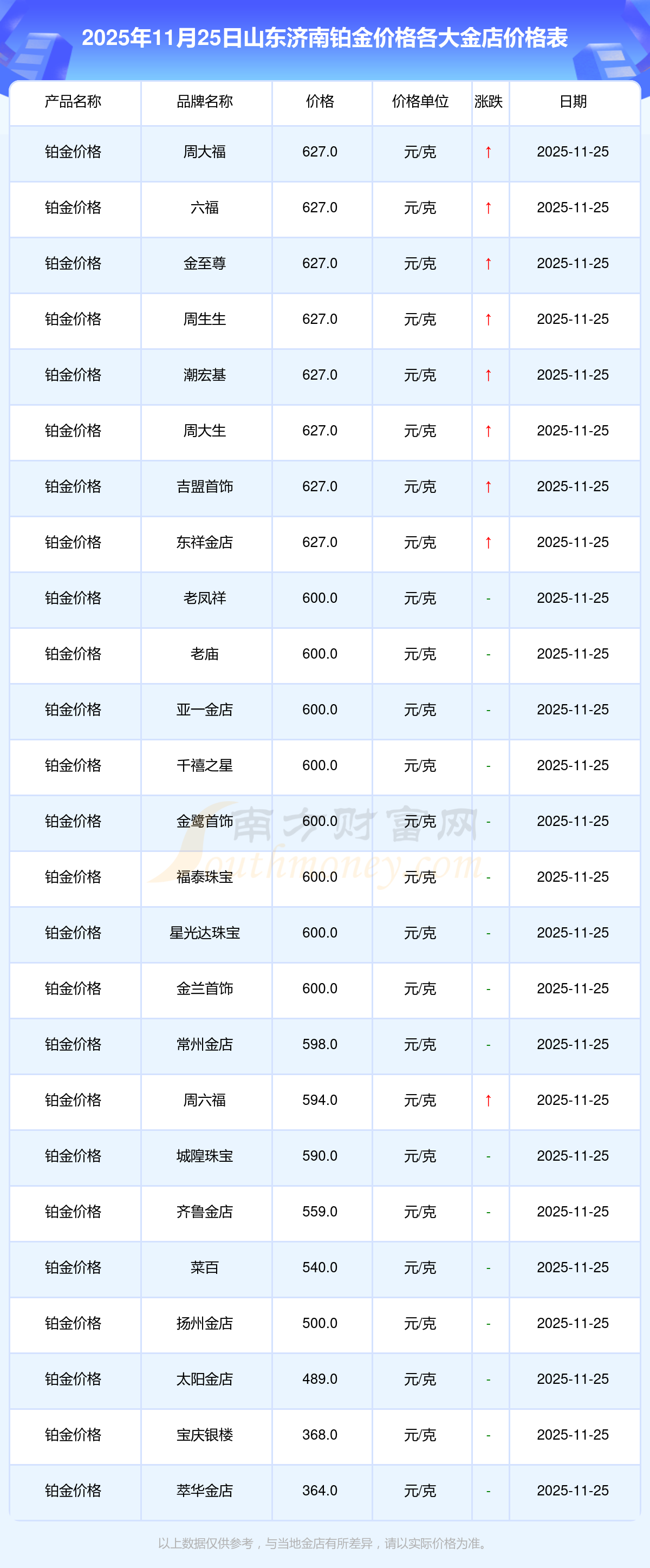 2025年11月25日山東濟(jì)南各大金店鉑金價(jià)格最新價(jià)格查詢(xún)來(lái)了:周大福1312.0元/克,周大福627.0元/克,周大福1312.0元/克,周大福45780.0,周大福17900.0,周大福41290.0,周大福1148.0元/克,老鳳祥1315.0元/克,老鳳祥600.0元/克,老鳳祥1315.0元/克,周六福1278.0元/克。