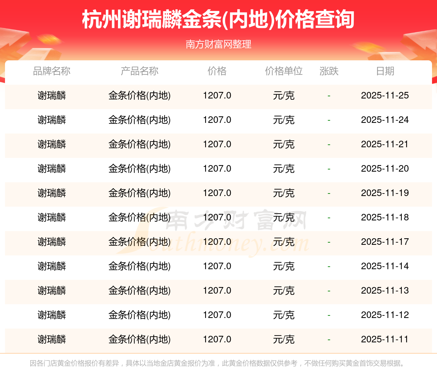 杭州謝瑞麟在 2025年11月25日,金條價(jià)格(內(nèi)地)的售賣價(jià)格是 1207.0元/克。