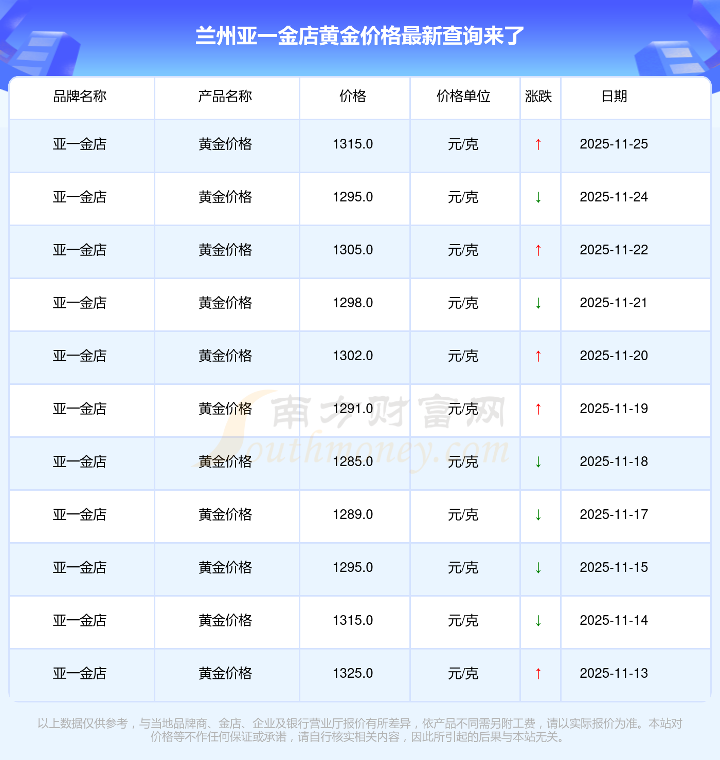 2025年11月25日周大福、周大福、周大福、周大福、周大福、周大福、周大福、老鳳祥、老鳳祥、老鳳祥、周六福等各大金店品牌黃金價(jià)格最新價(jià)格如下:周大福黃金價(jià)格1312.0元/克,周大福鉑金價(jià)格627.0元/克,周大福飾品金價(jià)(內(nèi)地)1312.0元/克,周大福黃金飾品(香港)45780.0,周大福鉑金價(jià)格(香港)17900.0,周大福金條價(jià)格(香港)41290.0,周大福金條金價(jià)(內(nèi)地)1148.0元/克,老鳳祥黃金價(jià)格1315.0元/克,老鳳祥鉑金價(jià)格600.0元/克,老鳳祥足金價(jià)格1315.0元/克,周六福黃金價(jià)格1278.0元/克。