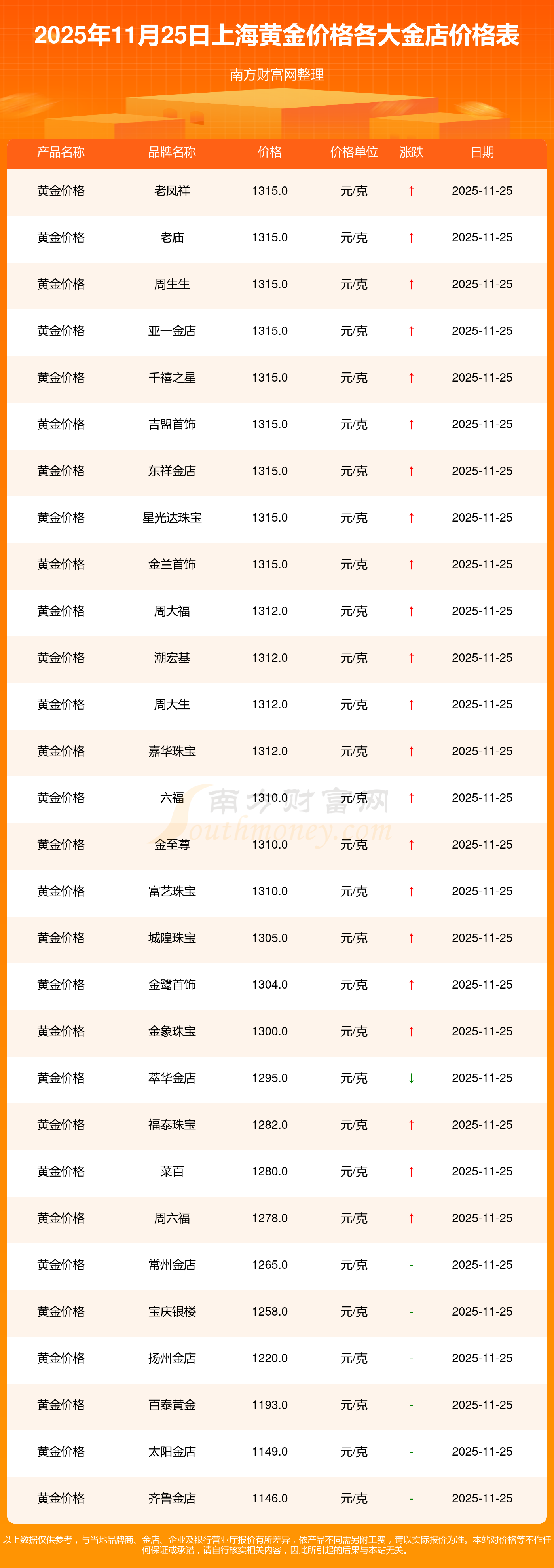 2025年11月25日,上海周大福、周大福、周大福、周大福、周大福、周大福、周大福、老鳳祥、老鳳祥、老鳳祥、周六福等各大金店品牌黃金價(jià)格今日價(jià)格行情最新來了:周大福1312.0元/克、周大福627.0元/克、周大福1312.0元/克、周大福45780.0、周大福17900.0、周大福41290.0、周大福1148.0元/克、老鳳祥1315.0元/克、老鳳祥600.0元/克、老鳳祥1315.0元/克、周六福1278.0元/克。