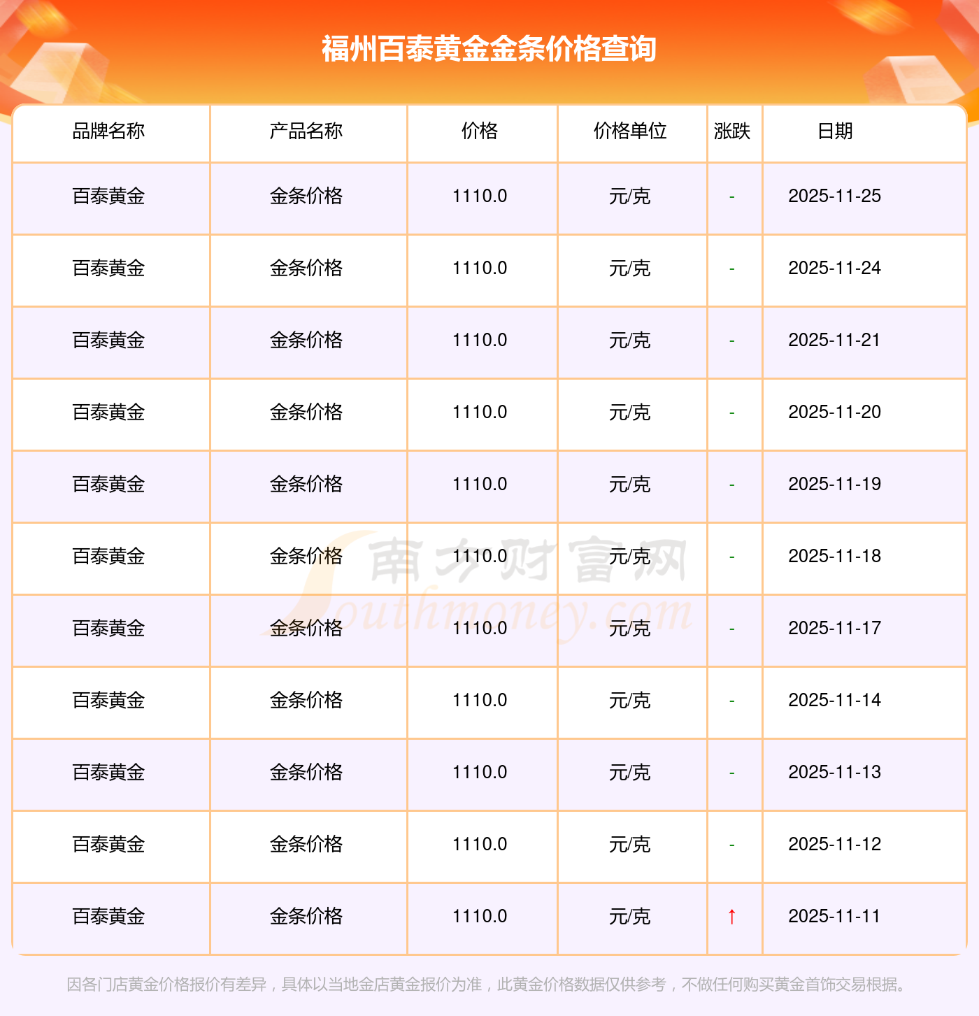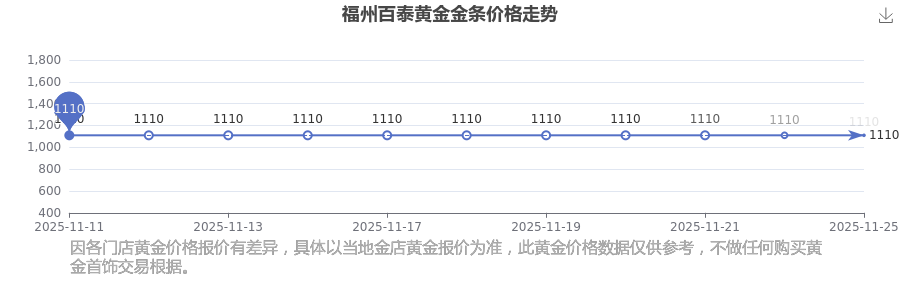 (2025年11月25日)今日福州百泰黃金金條價(jià)格是1110.0元/克。