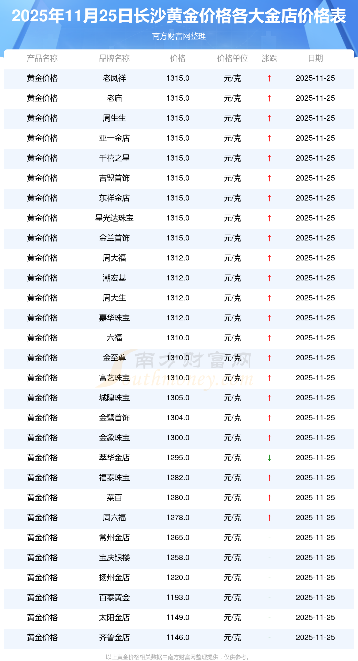 2025年11月25日長沙周大福、周大福、周大福、周大福、周大福、周大福、周大福、老鳳祥、老鳳祥、老鳳祥、周六福等各大金店品牌黃金價(jià)格最新價(jià)格如下:周大福黃金價(jià)格1312.0元/克,周大福鉑金價(jià)格627.0元/克,周大福飾品金價(jià)(內(nèi)地)1312.0元/克,周大福黃金飾品(香港)45780.0,周大福鉑金價(jià)格(香港)17900.0,周大福金條價(jià)格(香港)41290.0,周大福金條金價(jià)(內(nèi)地)1148.0元/克,老鳳祥黃金價(jià)格1315.0元/克,老鳳祥鉑金價(jià)格600.0元/克,老鳳祥足金價(jià)格1315.0元/克,周六福黃金價(jià)格1278.0元/克。