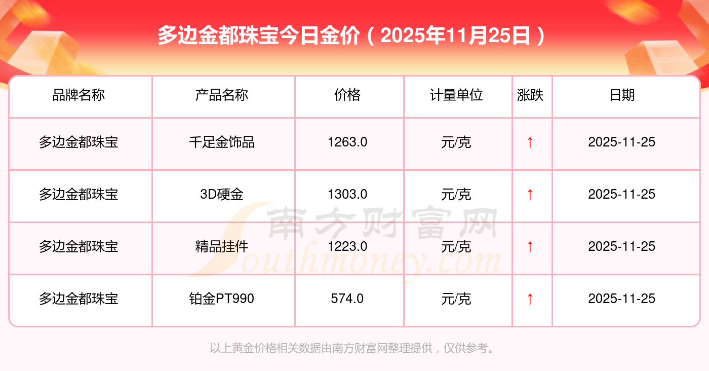 2025年11月25日多邊金都珠寶金價查詢:黃金價格1312.0元/克,鉑金價格627.0元/克,飾品金價(內地)1312.0元/克,黃金飾品(香港)45780.0,鉑金價格(香港)17900.0,金條價格(香港)41290.0,金條金價(內地)1148.0元/克,黃金價格1315.0元/克,鉑金價格600.0元/克,足金價格1315.0元/克,黃金價格1278.0元/克。