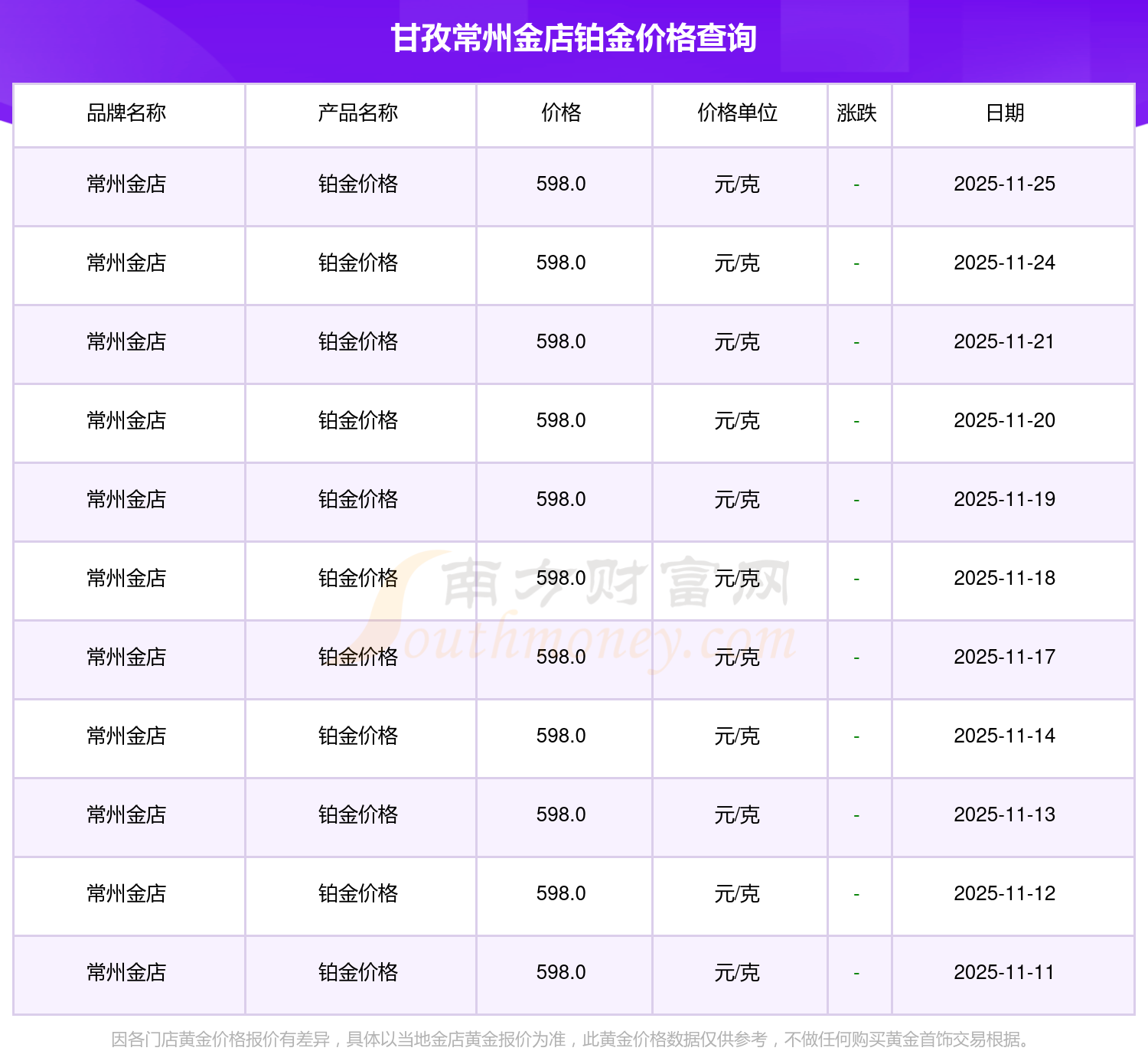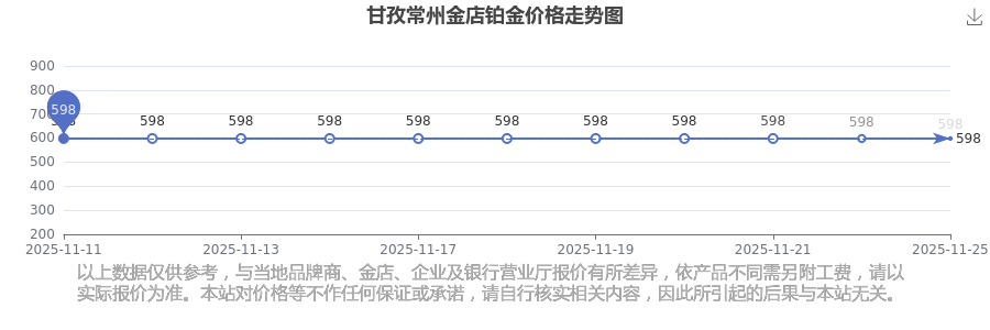 2025年11月25日,甘孜常州金店鉑金價(jià)格每克的售賣價(jià)位為598.0元/克。