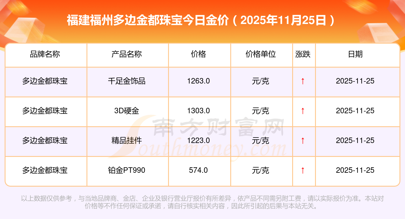 2025年11月25日福建福州多邊金都珠寶今日價格:黃金價格1312.0元/克,鉑金價格627.0元/克,飾品金價(內(nèi)地)1312.0元/克,黃金飾品(香港)45780.0,鉑金價格(香港)17900.0,金條價格(香港)41290.0,金條金價(內(nèi)地)1148.0元/克,黃金價格1315.0元/克,鉑金價格600.0元/克,足金價格1315.0元/克,黃金價格1278.0元/克。