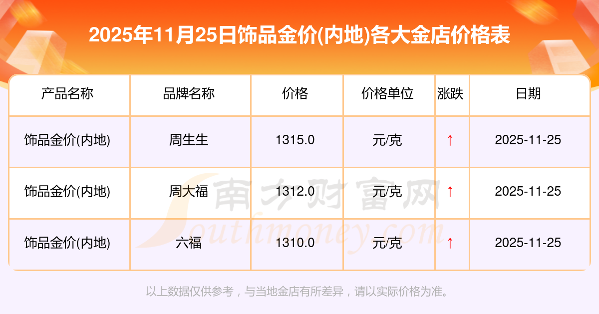 2025年11月25日周大福、周大福、周大福、周大福、周大福、周大福、周大福、老鳳祥、老鳳祥、老鳳祥、周六福等各大金店品牌飾品金價(jià)(內(nèi)地)最新價(jià)格如下:周大福黃金價(jià)格1312.0元/克,周大福鉑金價(jià)格627.0元/克,周大福飾品金價(jià)(內(nèi)地)1312.0元/克,周大福黃金飾品(香港)45780.0,周大福鉑金價(jià)格(香港)17900.0,周大福金條價(jià)格(香港)41290.0,周大福金條金價(jià)(內(nèi)地)1148.0元/克,老鳳祥黃金價(jià)格1315.0元/克,老鳳祥鉑金價(jià)格600.0元/克,老鳳祥足金價(jià)格1315.0元/克,周六福黃金價(jià)格1278.0元/克。
