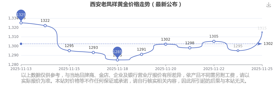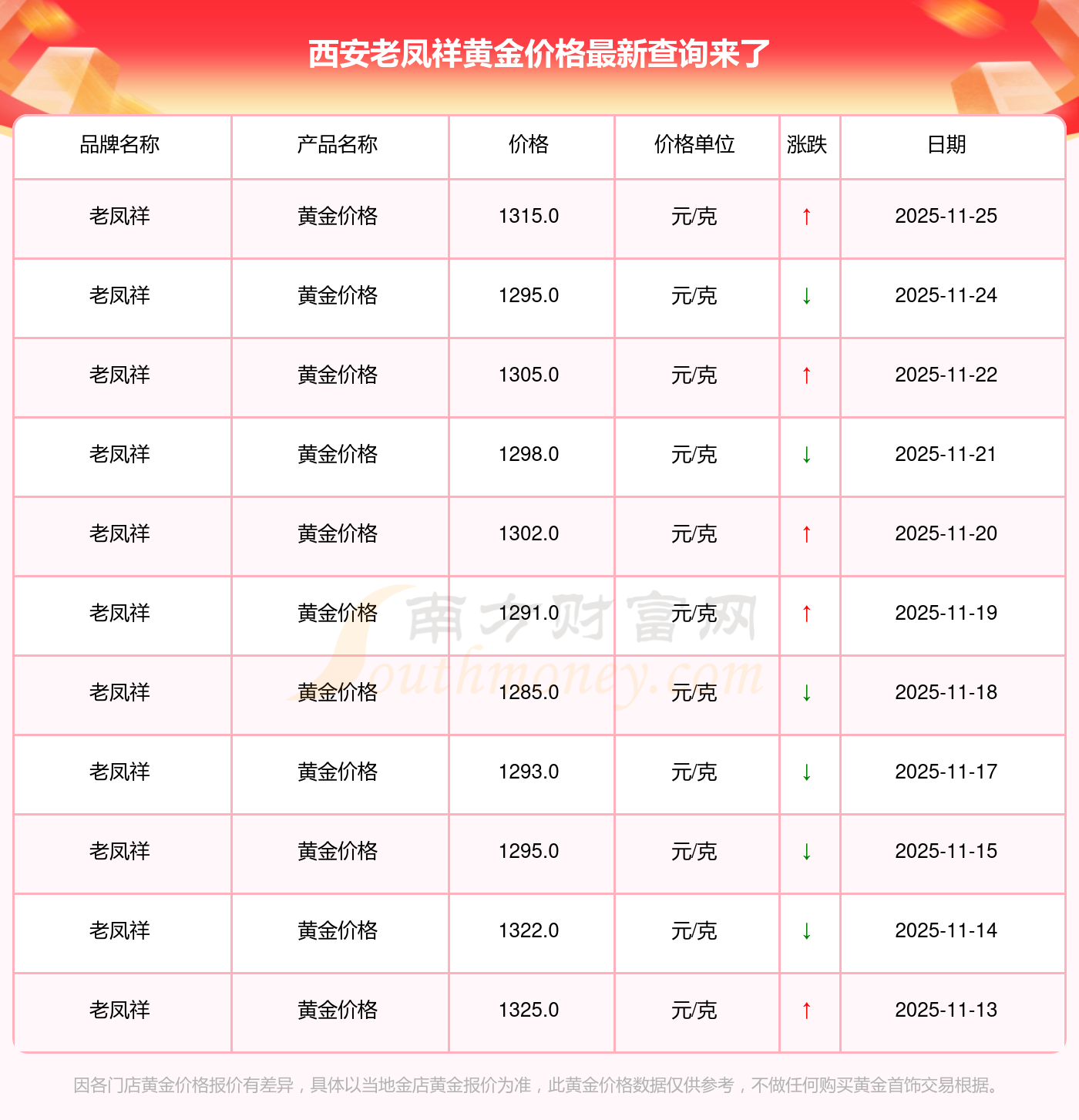2025年11月25日,西安老鳳祥黃金價(jià)格每克的售賣價(jià)位為1315.0元/克。