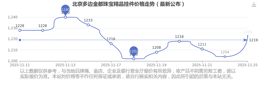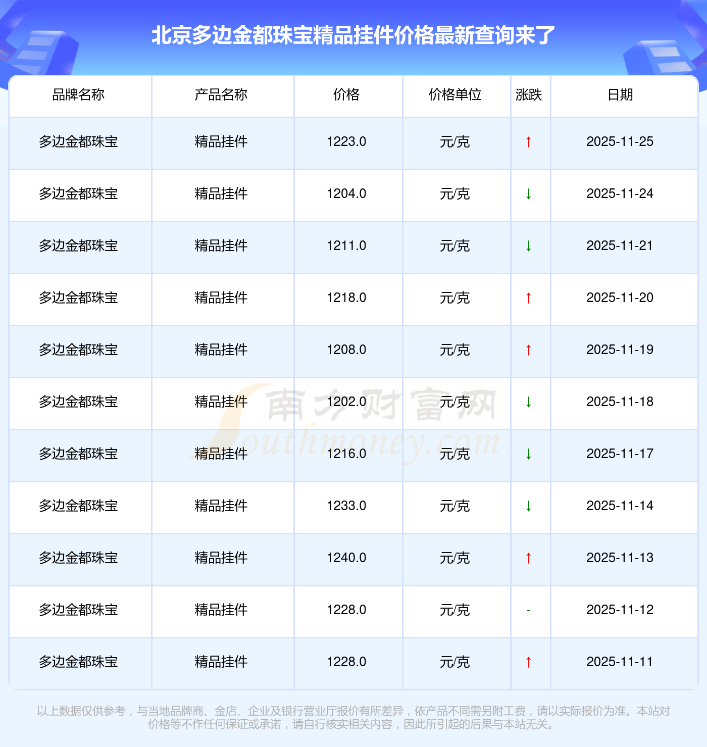 今日(2025年11月25日)北京多邊金都珠寶精品掛件價格:1223.0元/克。
