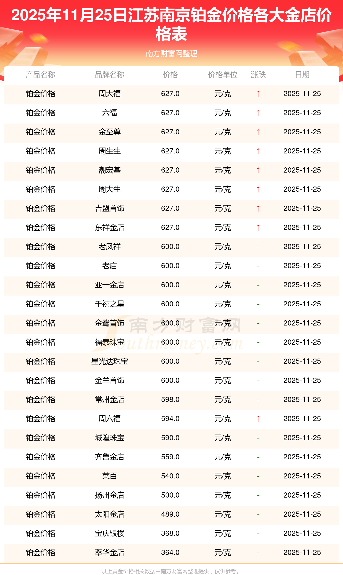 2025年11月25日,江蘇南京周大福、周大福、周大福、周大福、周大福、周大福、周大福、老鳳祥、老鳳祥、老鳳祥、周六福等各大金店品牌鉑金價(jià)格今日價(jià)格行情最新來(lái)了:周大福1312.0元/克、周大福627.0元/克、周大福1312.0元/克、周大福45780.0、周大福17900.0、周大福41290.0、周大福1148.0元/克、老鳳祥1315.0元/克、老鳳祥600.0元/克、老鳳祥1315.0元/克、周六福1278.0元/克。