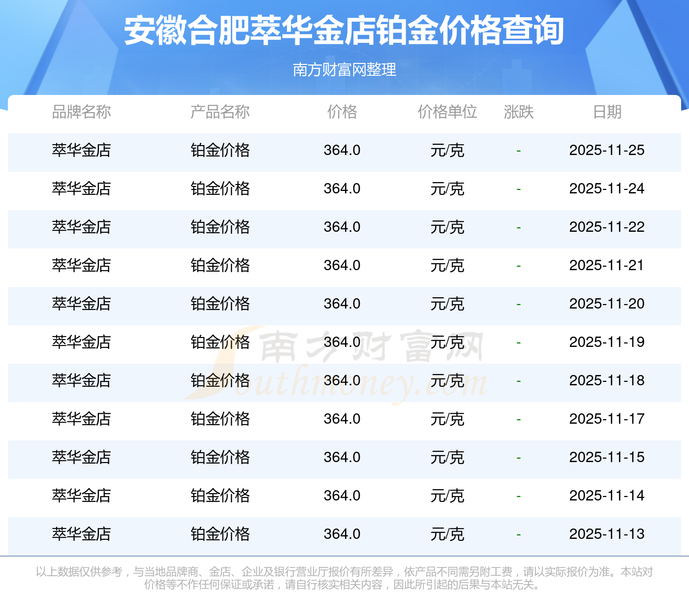 2025年11月25日安徽合肥萃華金店鉑金價(jià)格是364.0元/克。