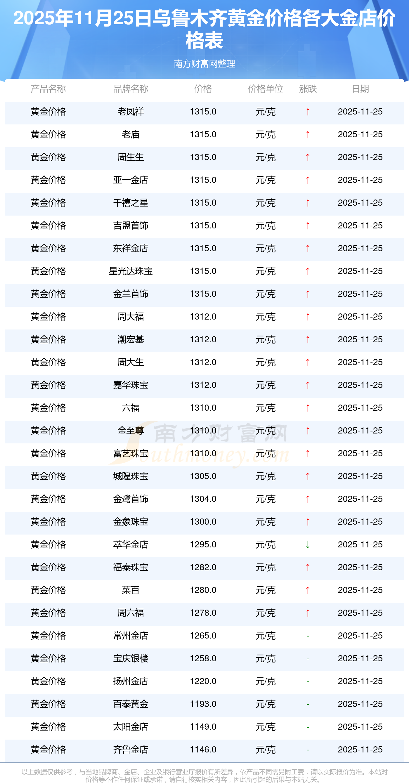 2025年11月25日烏魯木齊各大金店黃金價格最新價格查詢來了:周大福1312.0元/克,周大福627.0元/克,周大福1312.0元/克,周大福45780.0,周大福17900.0,周大福41290.0,周大福1148.0元/克,老鳳祥1315.0元/克,老鳳祥600.0元/克,老鳳祥1315.0元/克,周六福1278.0元/克。