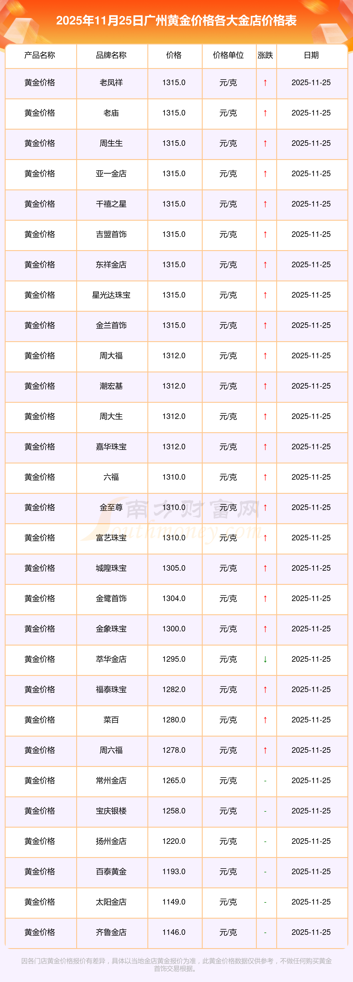 2025年11月25日廣州各大金店黃金價格最新價格:周大福1312.0元/克,周大福627.0元/克,周大福1312.0元/克,周大福45780.0,周大福17900.0,周大福41290.0,周大福1148.0元/克,老鳳祥1315.0元/克,老鳳祥600.0元/克,老鳳祥1315.0元/克,周六福1278.0元/克。
