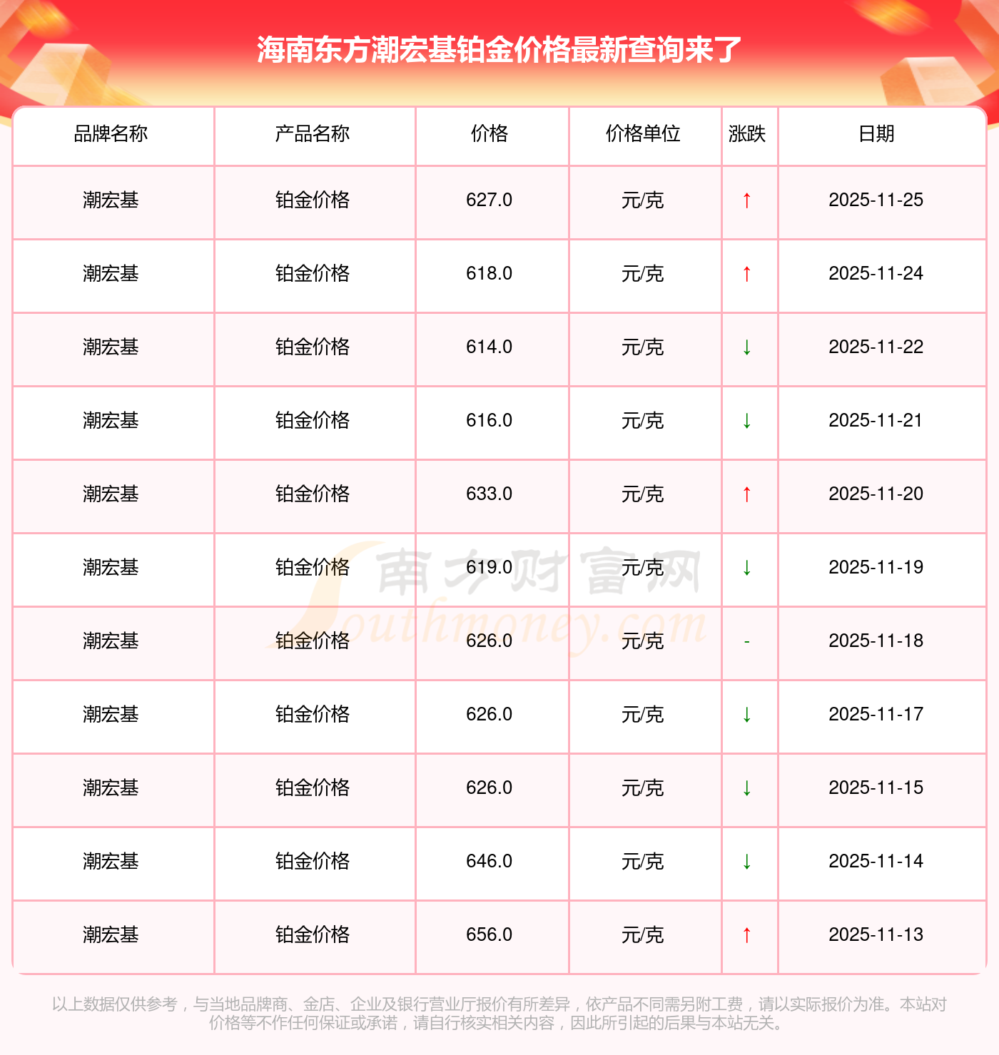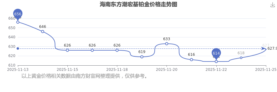2025年11月25日這一天,海南東方潮宏基的鉑金價(jià)格以 627.0元/克的價(jià)格售賣。