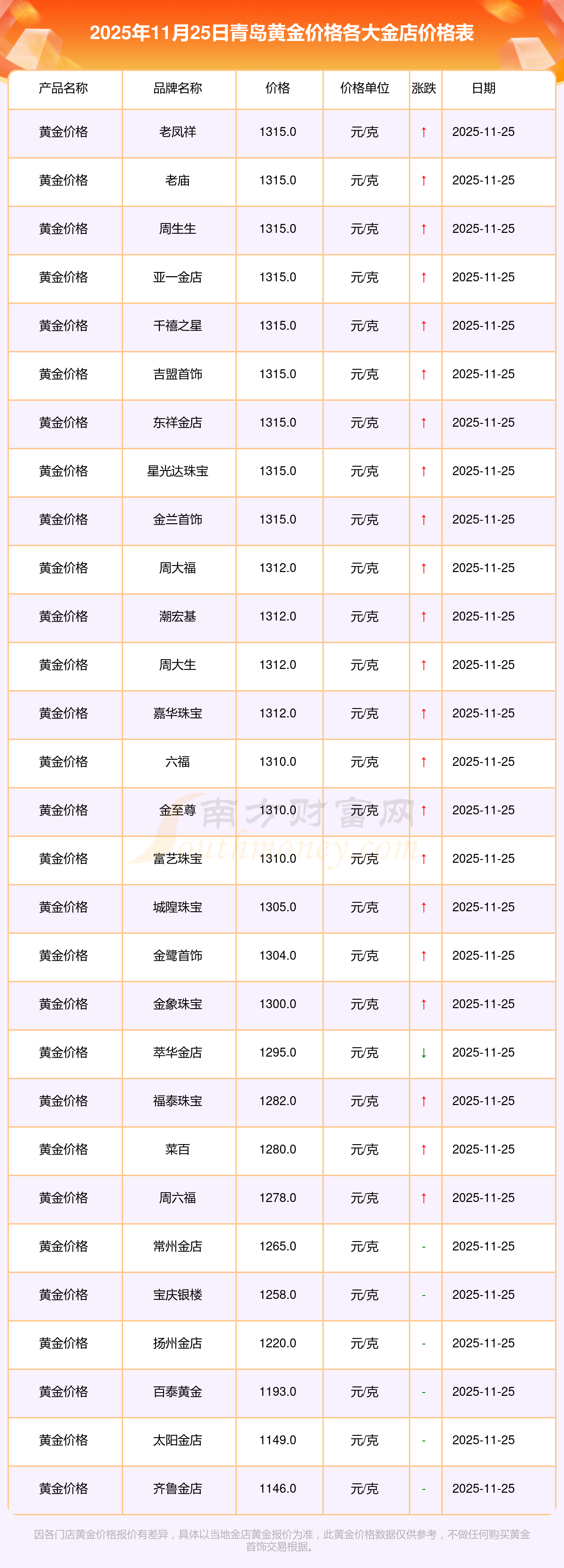 2025年11月25日,青島周大福、周大福、周大福、周大福、周大福、周大福、周大福、老鳳祥、老鳳祥、老鳳祥、周六福等各大金店品牌黃金價格今日價格如下:周大福1312.0元/克、周大福627.0元/克、周大福1312.0元/克、周大福45780.0、周大福17900.0、周大福41290.0、周大福1148.0元/克、老鳳祥1315.0元/克、老鳳祥600.0元/克、老鳳祥1315.0元/克、周六福1278.0元/克。