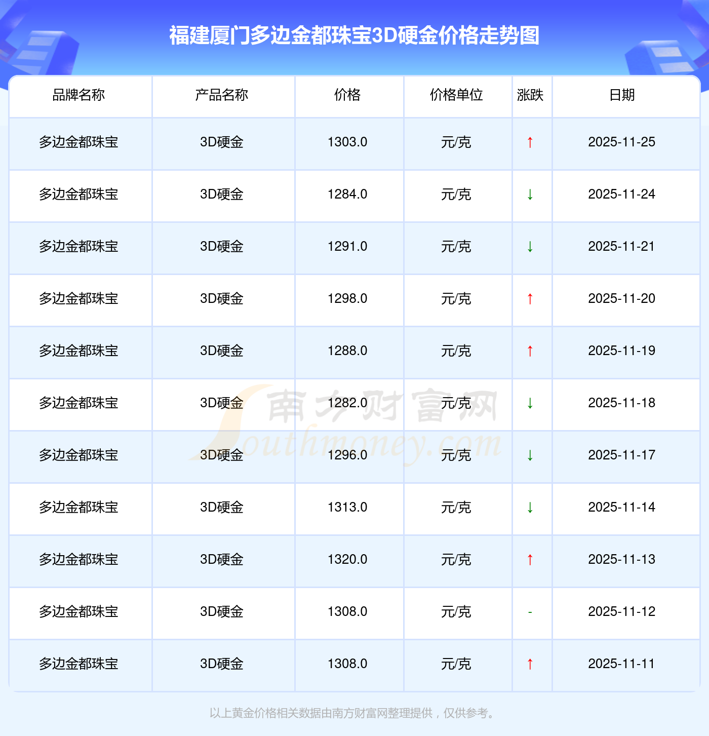 今日福建廈門多邊金都珠寶3D硬金價格查詢,2025年11月25日,福建廈門多邊金都珠寶的3D硬金標(biāo)價達到 1303.0元/克。