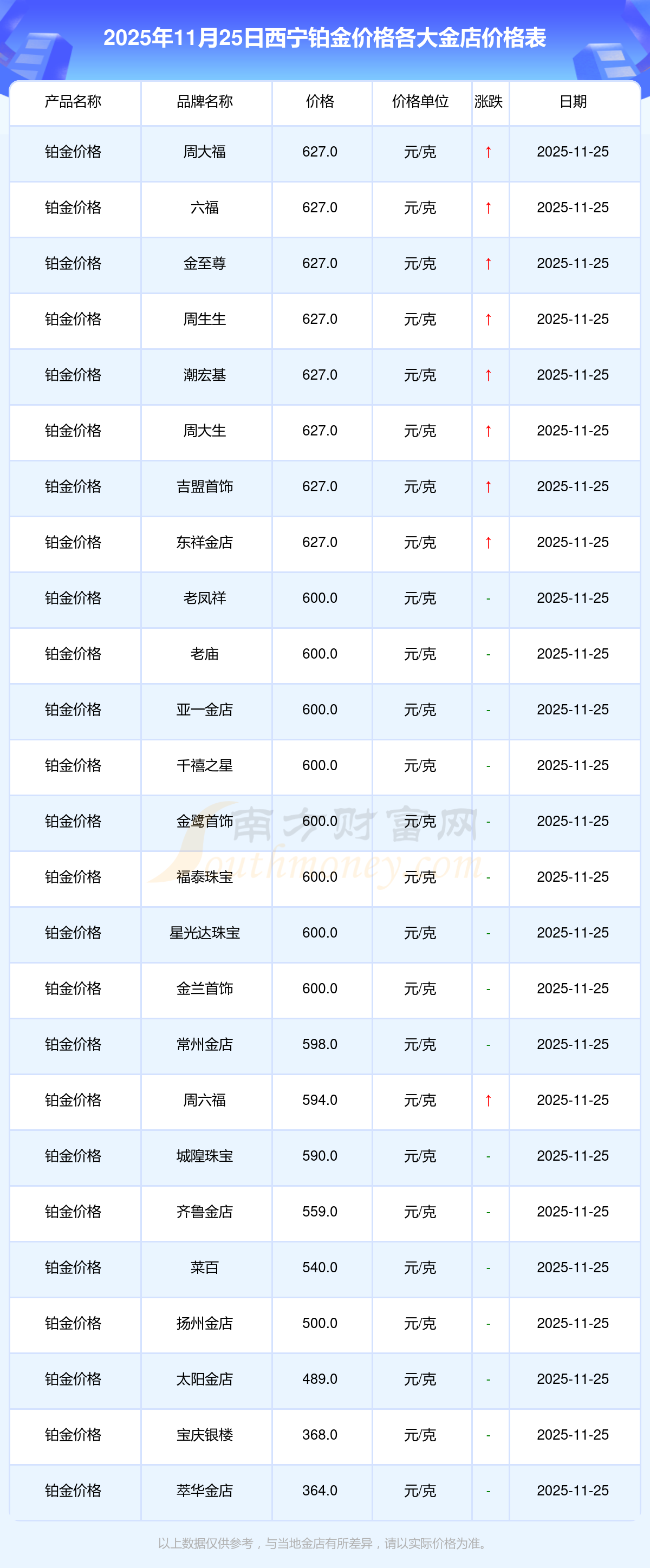 2025年11月25日,西寧周大福、周大福、周大福、周大福、周大福、周大福、周大福、老鳳祥、老鳳祥、老鳳祥、周六福等各大金店品牌鉑金價格今日價格行情最新來了:周大福1312.0元/克、周大福627.0元/克、周大福1312.0元/克、周大福45780.0、周大福17900.0、周大福41290.0、周大福1148.0元/克、老鳳祥1315.0元/克、老鳳祥600.0元/克、老鳳祥1315.0元/克、周六福1278.0元/克。