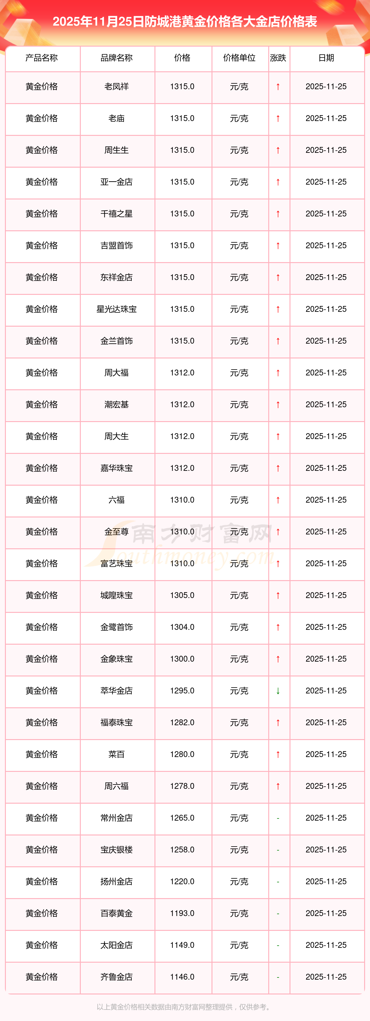 2025年11月25日,防城港周大福、周大福、周大福、周大福、周大福、周大福、周大福、老鳳祥、老鳳祥、老鳳祥、周六福等各大金店品牌黃金價格今日價格行情最新來了:周大福1312.0元/克、周大福627.0元/克、周大福1312.0元/克、周大福45780.0、周大福17900.0、周大福41290.0、周大福1148.0元/克、老鳳祥1315.0元/克、老鳳祥600.0元/克、老鳳祥1315.0元/克、周六福1278.0元/克。