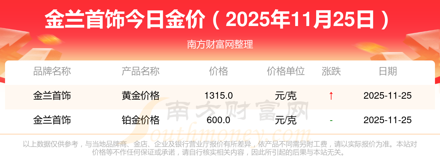 現(xiàn)在金蘭首飾黃金價(jià)格是多少錢1克_2025年金蘭首飾今日金價(jià)是多少錢一克,最新金蘭首飾查詢,2025年11月25日金蘭首飾鉑金價(jià)格現(xiàn)在每克多少錢?最新金蘭首飾鉑金價(jià)格報(bào)價(jià)公布,一起來看看吧!