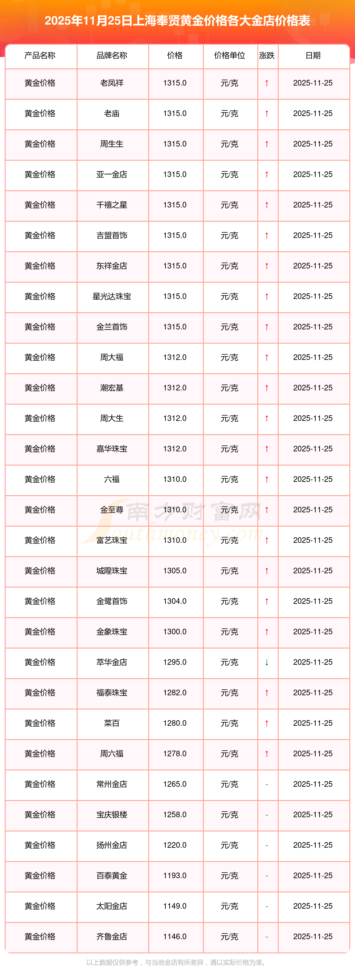 二、2025年11月25日今日上海奉賢各金店黃金價(jià)格是多少錢一克?