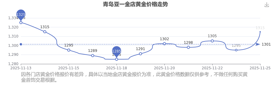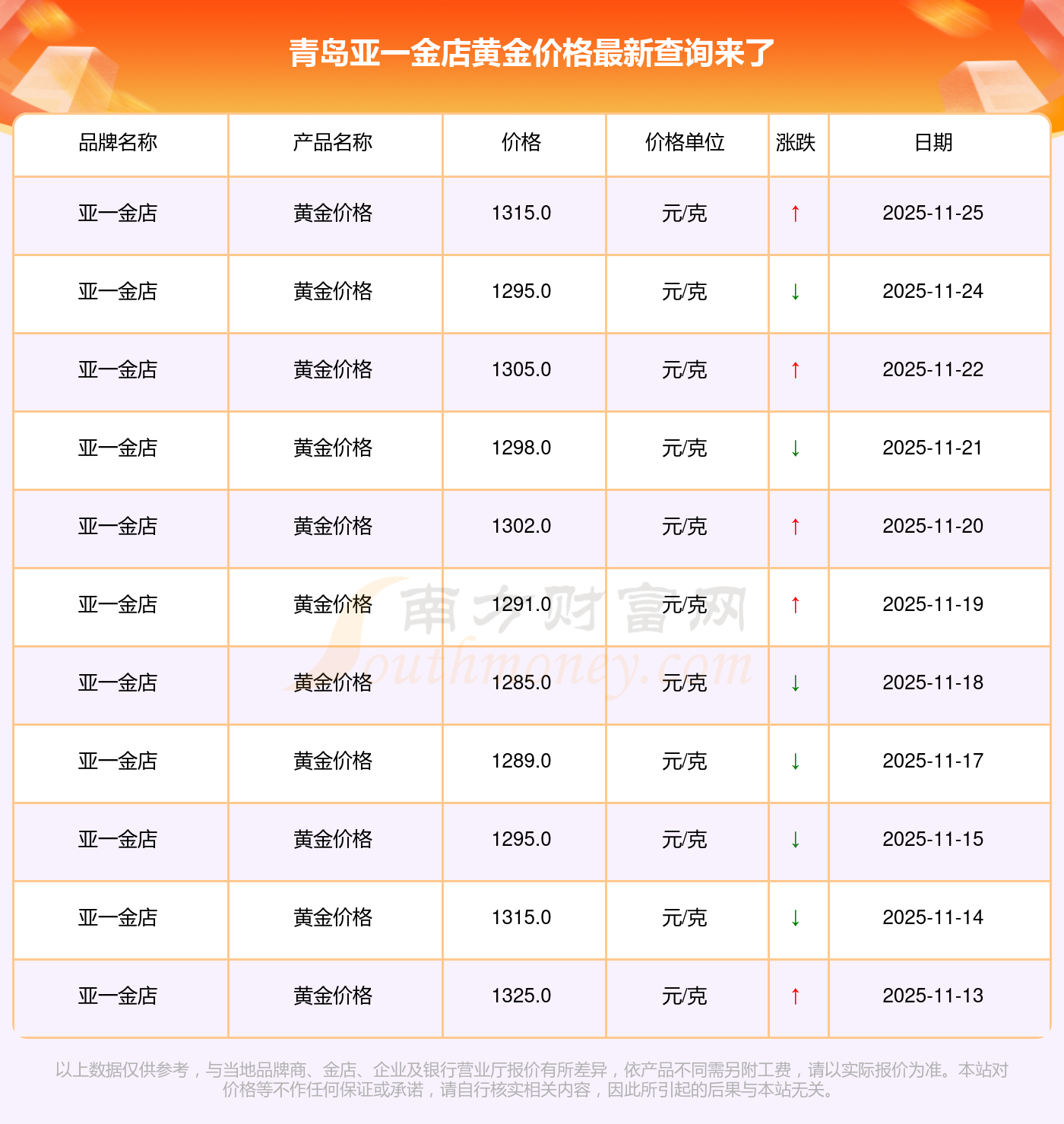 今日青島亞一金店黃金價格的價格為1315.0元/克。