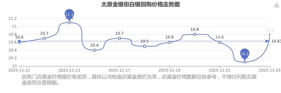 太原金銀街的白銀回購(gòu)在今日(2025年11月25日),每克售價(jià)為10.8元/克。