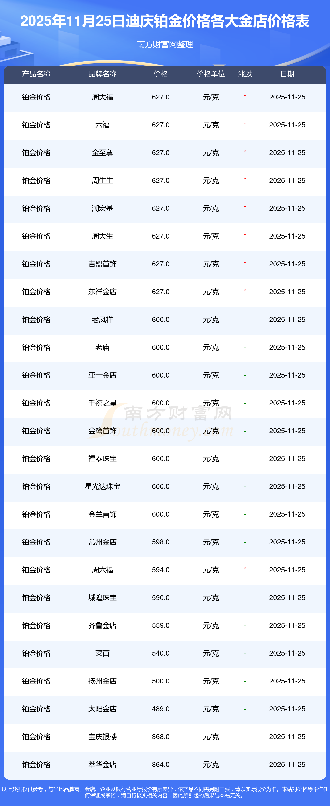 2025年11月25日,迪慶周大福、周大福、周大福、周大福、周大福、周大福、周大福、老鳳祥、老鳳祥、老鳳祥、周六福等各大金店品牌鉑金價(jià)格今日價(jià)格行情最新來(lái)了:周大福1312.0元/克、周大福627.0元/克、周大福1312.0元/克、周大福45780.0、周大福17900.0、周大福41290.0、周大福1148.0元/克、老鳳祥1315.0元/克、老鳳祥600.0元/克、老鳳祥1315.0元/克、周六福1278.0元/克。