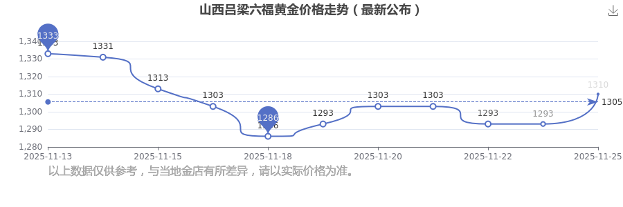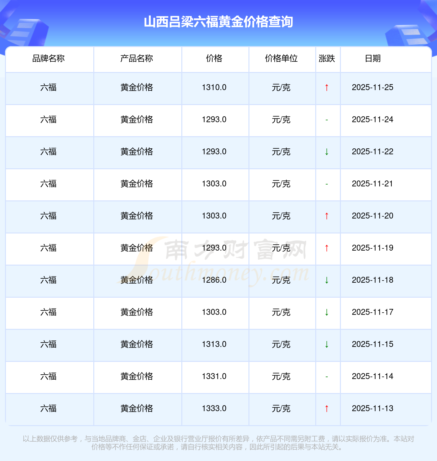 山西呂梁六福黃金價格在 2025年11月25日,其市場價格為 1310.0元/克。