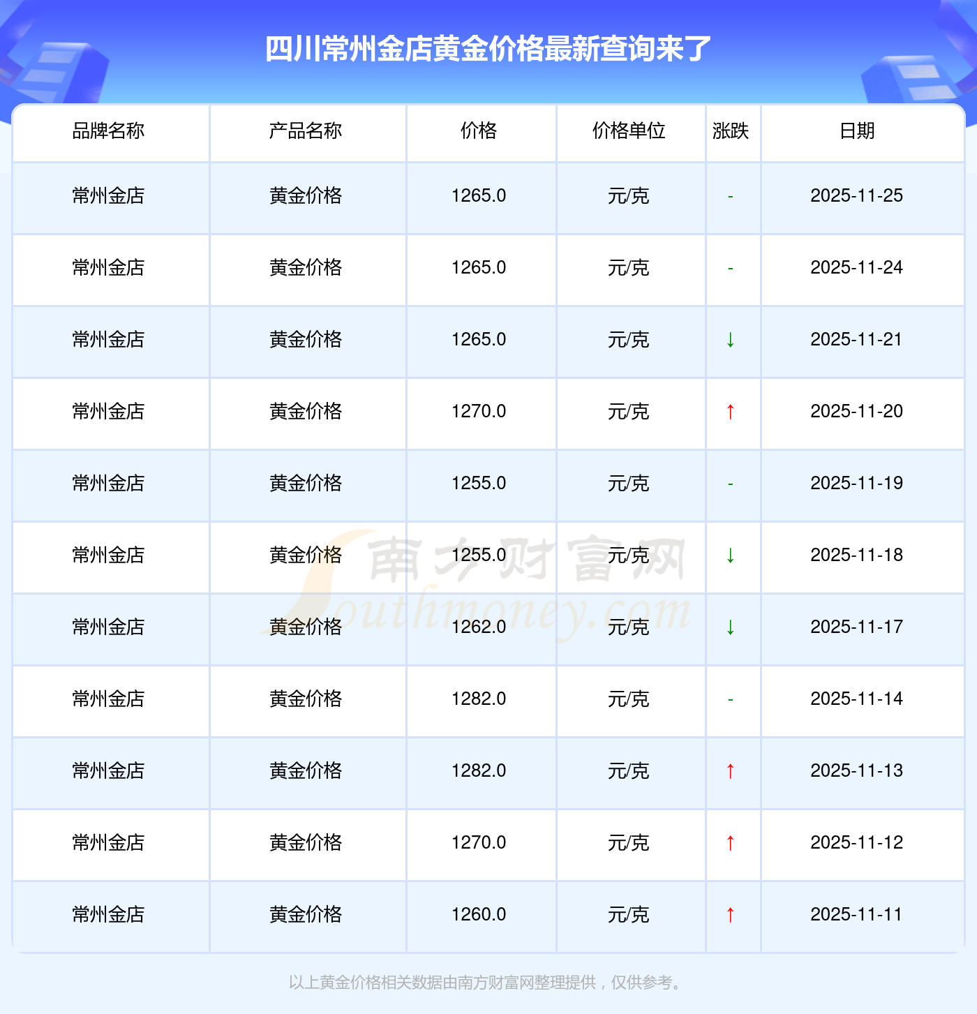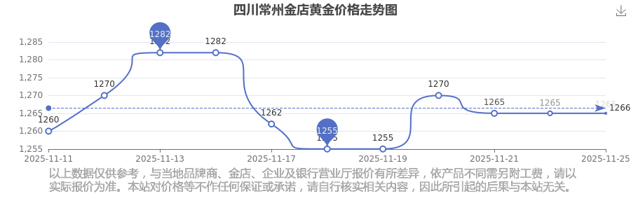 2025年11月25日四川常州金店黃金價格為1265.0元/克。