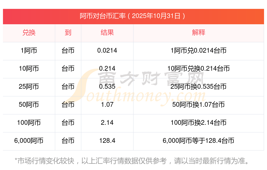 今日匯率阿幣 阿幣兌臺(tái)幣今天匯率是多少?2025/10/31