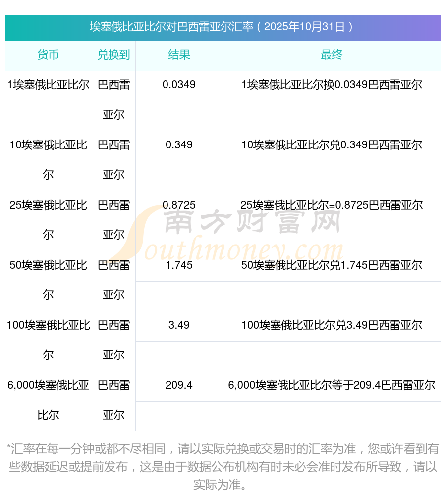 最新2025年10月31日埃塞俄比亞比爾兌換巴西雷亞爾匯率是:0.0349