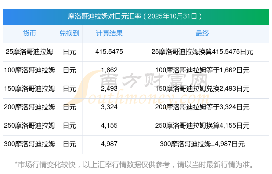 今日迪拉姆匯率行情 1摩洛哥迪拉姆等于多少日元?2025-10-31