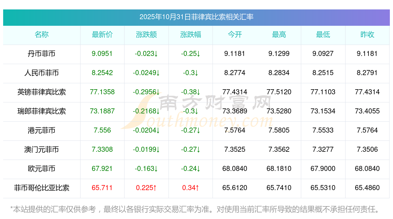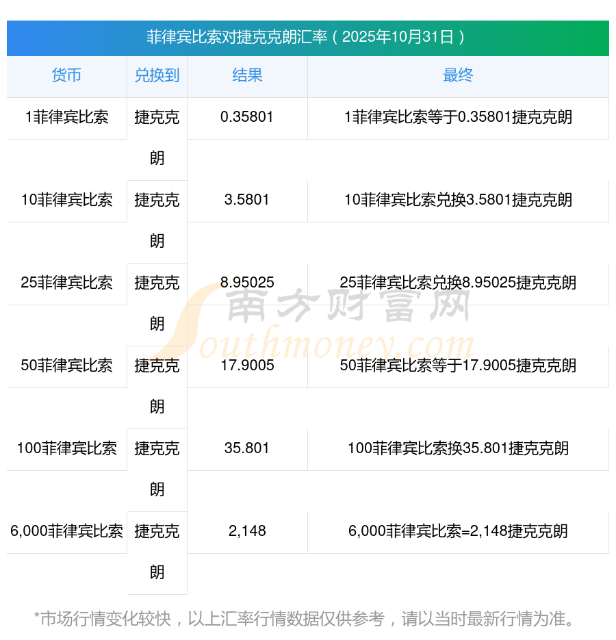 今日結(jié)匯行情:菲律賓比索對(duì)捷克克朗匯率表2025/10/31