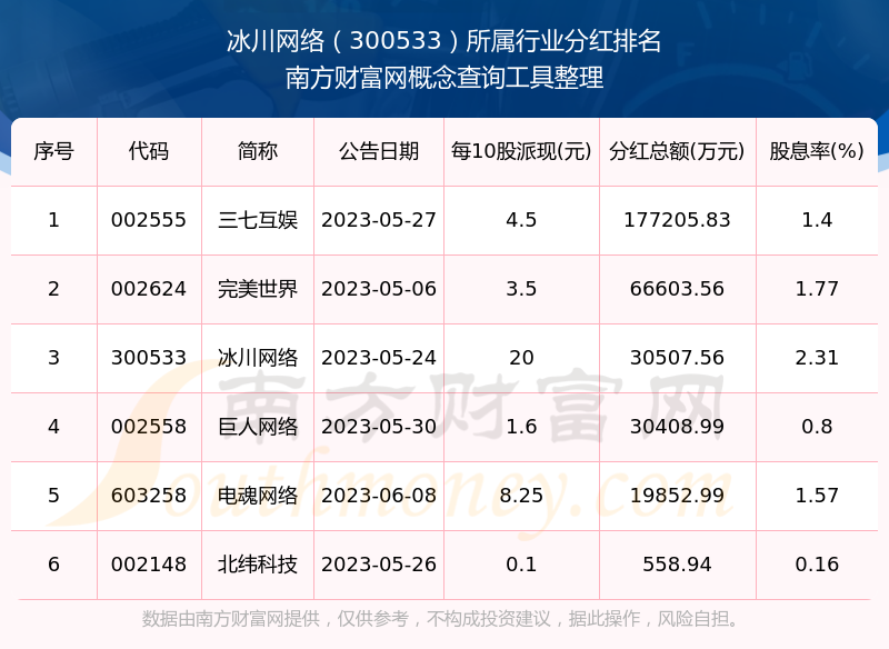 按照南方財富網(wǎng)趨勢選股系統(tǒng)統(tǒng)計,冰川網(wǎng)絡(luò)所屬行業(yè)為網(wǎng)絡(luò)游戲行業(yè),網(wǎng)絡(luò)游戲行業(yè)分紅排名情況如下表: