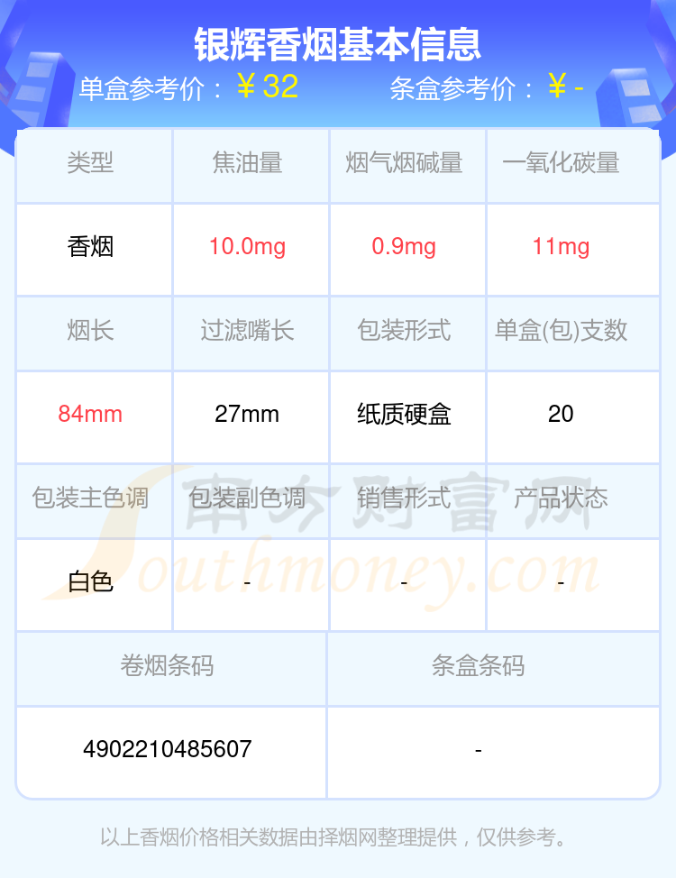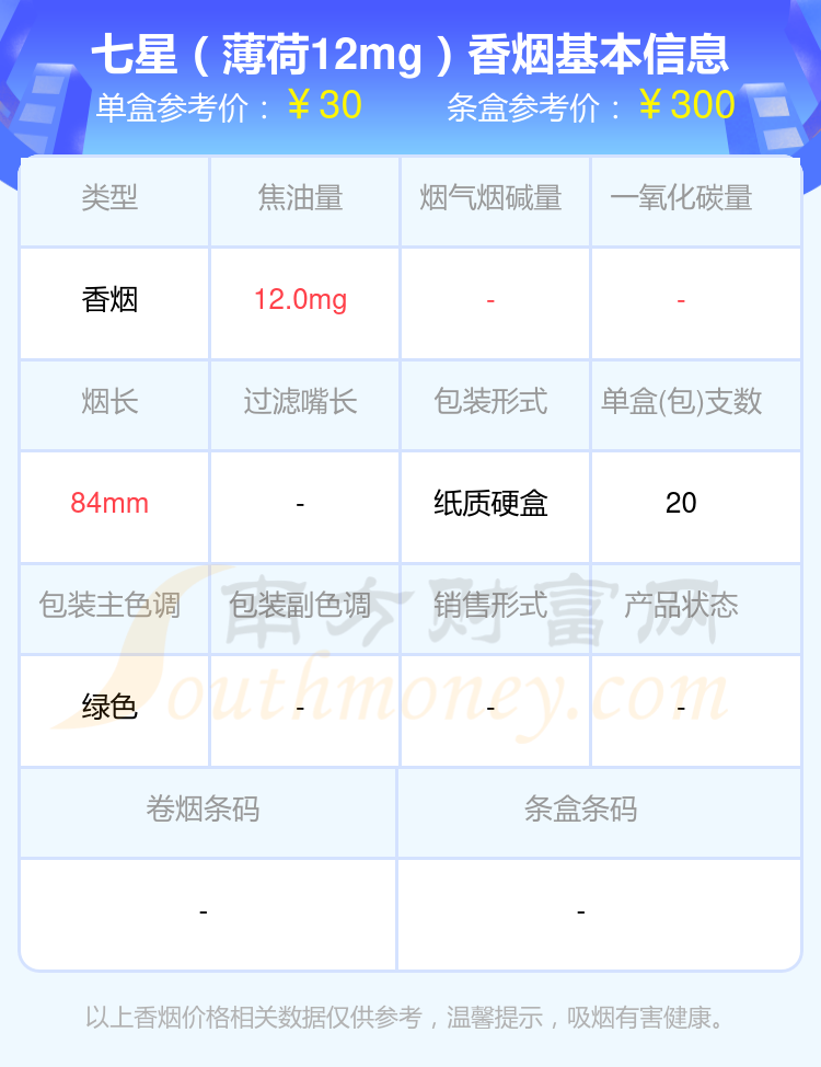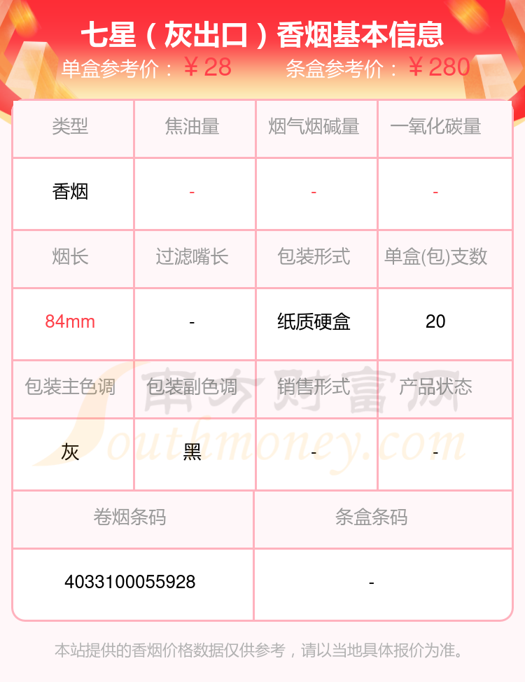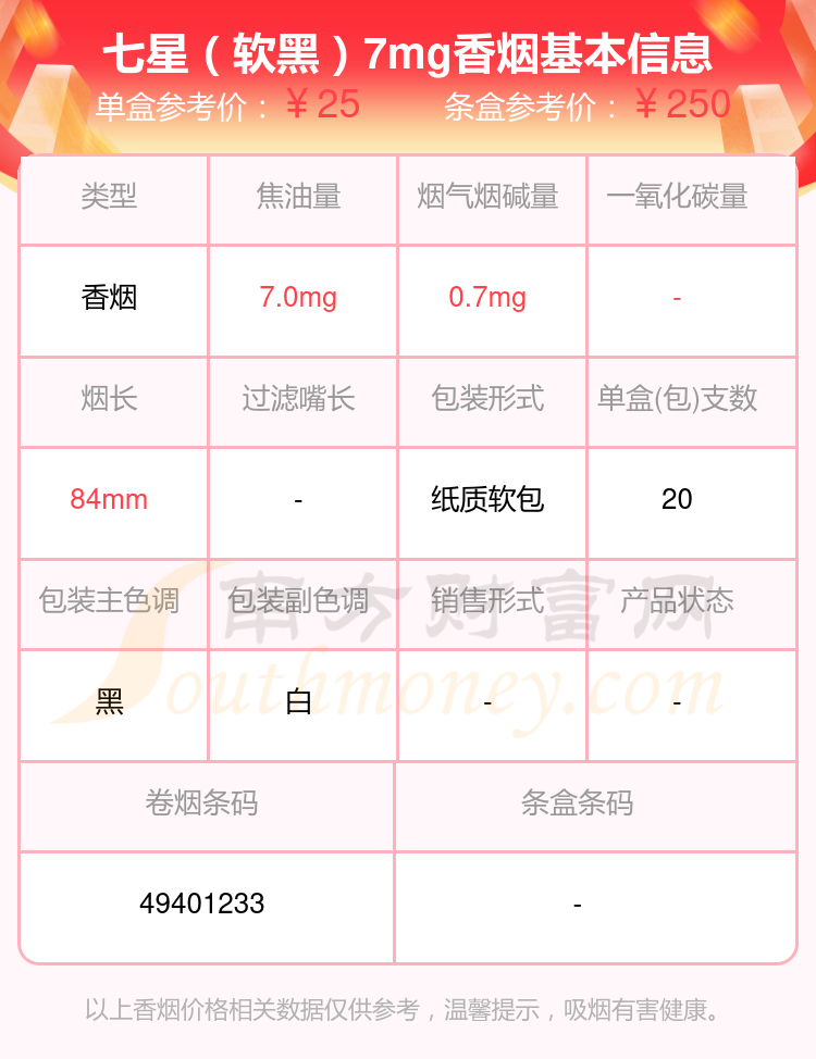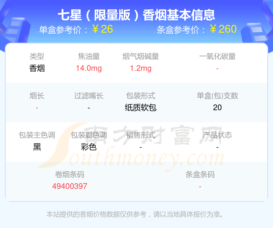 銀輝參考價(jià)32.0元/包、七星(薄荷12mg)參考價(jià)30.0元/包、七星(灰出口)參考價(jià)28.0元/包、七星(限量版)參考價(jià)26.0元/包、七星(軟黑)7mg參考價(jià)25.0元/包、七星(臺(tái)灣黃標(biāo))參考價(jià)22.0元/包等。