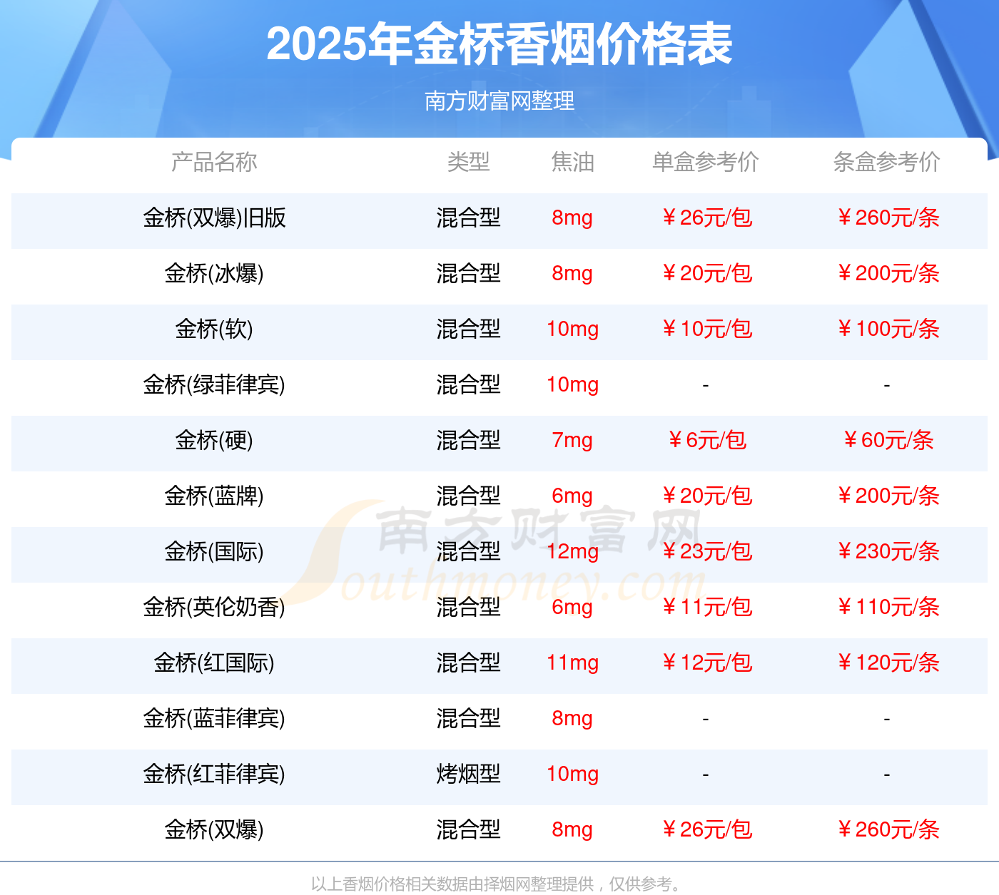 2025金橋香煙多少錢一盒(金橋煙價格列表)