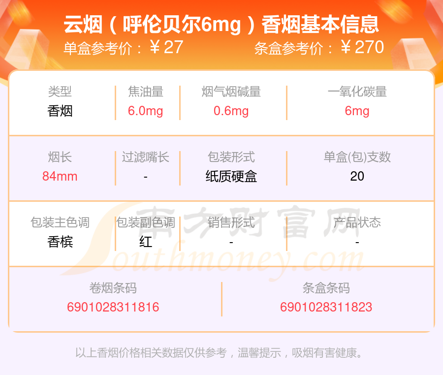 云煙(呼倫貝爾6mg)條盒參考價:270元